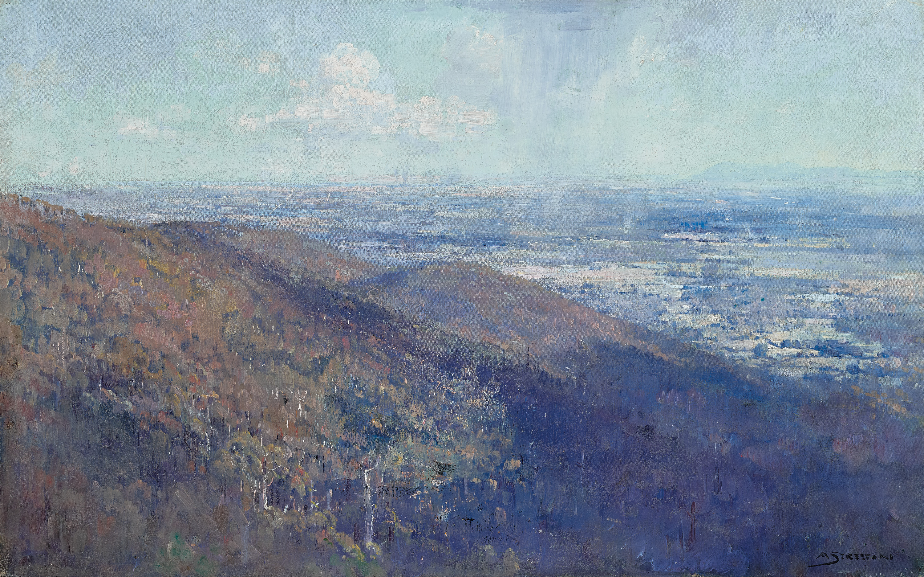 Streeton’s mastery is on full display here, the foreground hills resembling a patchwork of deep shadow contrasting with illuminated areas, the white trunks of tall trees glistening in the light. The cloudy, pale blue sky is marked by soft vertical brushstrokes which describe a shower of rain just right of centre, and highlight Streeton’s direct observation of the subject. Exhibited both in Melbourne and Sydney in 1921, the painting drew appreciative comment from contemporary critics, one of whom wrote that ‘the Victorian metropolis is… little more than suggested, [but] the interest [arises] from the poetry of the treatment… Melbourne from Sassafras, affords a nearer glimpse [of the city], but the interest is chiefly due to the clever handling of the sky from which showers of rain over the level field break the light. The technical difficulty of suggesting the myriad of trees massed on the rising steep in the foreground has been overcome with a sombre effect which contrasts with the animation of the scene below.’5