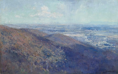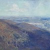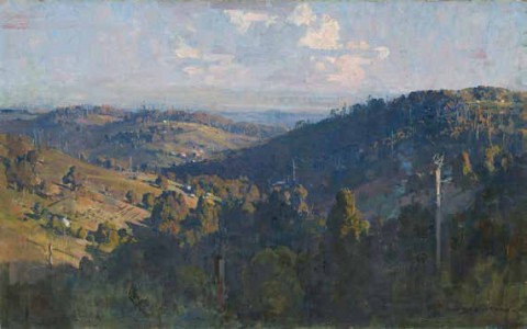 Located close to the highest peak of Mount Dandenong and just a short distance from Olinda, the township of Sassafras is named after a native evergreen tree which grows in the area’s cool temperate conditions. Streeton painted there on several occasions during 1921, and in Melbourne from Sassafras, 1921, he presents a monumental panoramic view. From a high vantage point, the scene looks out across densely treed hills in the foreground, opening up to a broad expanse of flat, partially cleared land that extends towards the distant city beyond. From his earliest painted impressions, such as those included in the famous 9x5 Impression Exhibition in 1889, to images of Sydney Harbour and classic ‘blue and gold’ pastoral landscapes, Streeton’s ability to convincingly depict light and atmosphere was a distinctive skill often commented upon by critics: ‘It all appears to be so simple – a daub of paint here and another of different colour there… A master of his medium, he gives us everything else… The great thing is the lasting impression of a landscape filled with light’.4