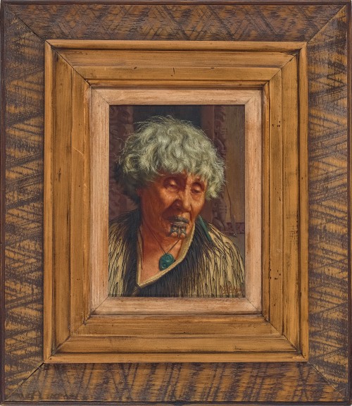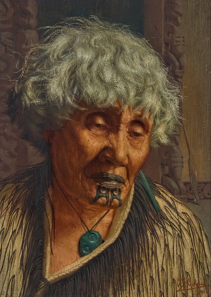 What Goldie has done is transform Ena into his symbolic image of an old Maori chieftainess lost in recollections of earlier pre-colonial times. The title Memories captures that idea succinctly. In another, larger painting of Ena in the Dunedin Art Gallery the title is expanded to ‘The memory of what has been and never more will be.’ Ena appears to have been a likeable character with a keen sense of humour who wore European dress and smoked a pipe. On occasion Goldie showed her this way. While Goldie did not have great imaginative ability, he did have a commitment to conveying ideas and feelings through the mood of his paintings. At times he could be humorous as well as sad and nostalgic. He was not just a literal recorder of what was before him but an interpreter of the Maori at a time of great change. There is nothing to suggest that he had a deep knowledge of Maori language and culture. He did not speak Te Reo, Maori language, nor did he have engagement with their society. He was in many respects an outsider, but he took his art seriously and captured much of the dignity (mana) of his sitters in his paintings which are prized today by modern Maori as a treasure (taonga) to be handed down to future generations. He painted both male and female sitters favouring those who were older and had the traditional tattoo or moko. He rarely painted young women or young men.