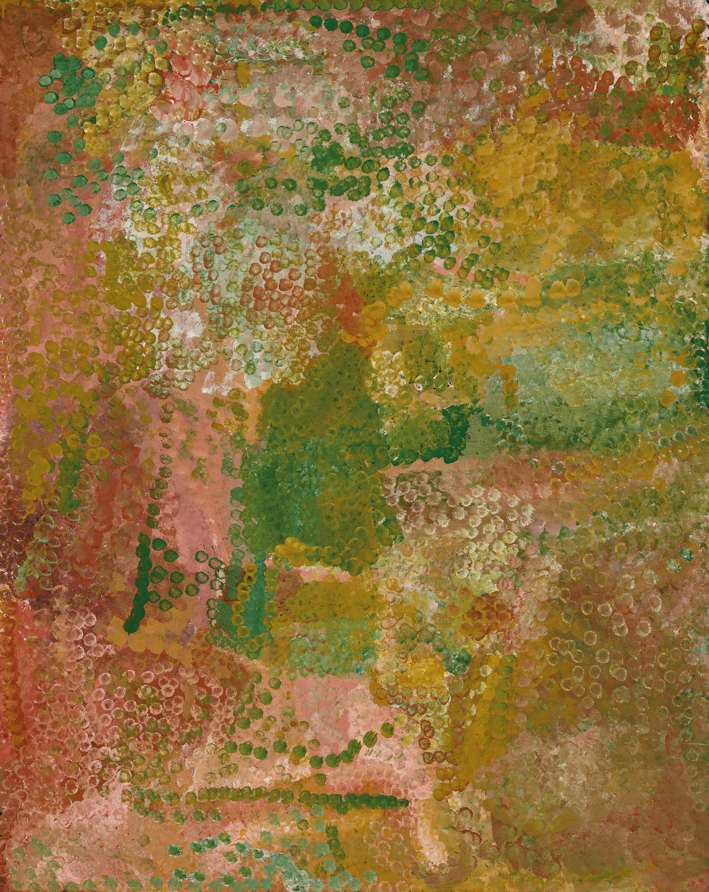 In the 1990s, Emily Kngwarreye, already in her eighth decade, publicly emerged as one of the world’s leading contemporary painters. Reflecting the total connectedness to the land to which she belongs, each painting became a metaphorical self-portrait and declaration of her people’s profound sovereignty over the land. Tackling massive canvases with confidence and verve beyond her years, Kngwarreye produced many masterpieces in her twilight years between 1992 and 1996.Her advancing years endowed her an increased motivation and impetus to visually express her country’s tjukurrpa, displaying extraordinary dynamism and nimble inventiveness in her varied mark making. Alhalkere, while extraordinarily remote, arid and hostile to life, is home to native yams, grasses as well as emus, dingos and lizards. The ceremonial cycles of many of these separate elements fell under Kngwarreye’s own purview as an elder within her community. Consequently, these multifarious dreamings coexist within her artworks – hidden amongst the densely packed dots and vigorous rhythmic parallel lines.
