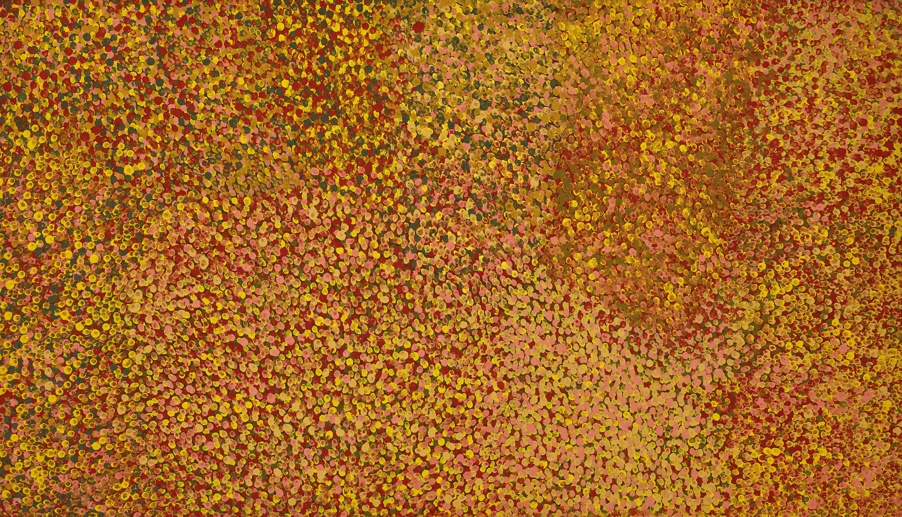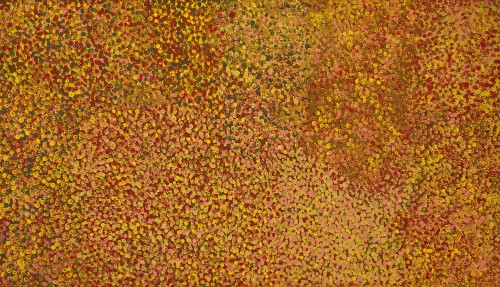 A response to the everchanging landscape of her traditional homelands at Alhalker (Alalgura), north-east of Alice Springs, the paintings of Emily Kngwarreye record her acute observation, often in minute detail, of the shifting fluctuations in the state of the flora around her, alerting her to the readiness of bush food or medicinal plants. Judith Ryan notes that, ‘clearly Emily Kngwarreye was a mark-maker extraordinaire…. she ventured further with masses of dots and marks, making intimate and grand gestures layering and intensifying the dots to the exclusion of graphic elements’1 and here in Merne (Everything) 1991, layers of olive, yellow, dusky pink, purple and grey dots – in many places applied by the artist using her fingers – produce fields-of-dots that faithfully evoke the colours of her country after early-summer rains when the first new growth appears through the parched earth after months of dryness. The black ground may be seen as the spread of the roots of Emily Kame Kngwarreye’s totemic yam plant underground, together with the spread of ancestral forces through the earth.