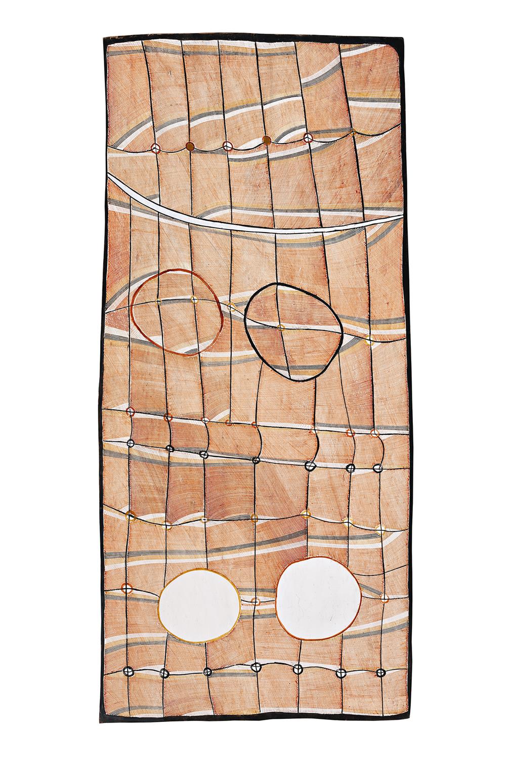 Milmilngkan is a billabong approximately 60 kilometres south of Maningrida in central Arnhem Land, a place where John Mawurndjul has a seasonal camp and house not far from the edge of a small creek. It is an important site in Kuninjku cosmology, for as Mawurndjul reveals in the accompanying certificate, beneath the water of Milmilngkan lies the power of Ngalyod the Rainbow serpent, a familiar subject of contemporary Kuninjku bark paintings. Ngalyod is associated with the creation of all sacred sites (djang) in Kuninjku clan lands and ancestral stories relate how creator or ancestral beings travelling across this country had angered Ngalyod who then swallowed them and returned to the earth to create this site. Today, Ngalyod protects all sacred sites and its power is present in each one. Having both powers of creation and destruction Ngalyod is most strongly associated with rain, monsoon seasons and rainbows. Being both a destroyer and a giver of life, Ngalyod's power controls the fertility of the country and the seasons.