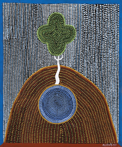 This work is accompanied by a certificate from Flinders Lane Gallery which states: ‘The patterning and detail in this work incorporate the symbols derived from central Australian Aboriginal art as well as the artist’s imaginative personal symbols that go beyond dots. One major theme of the artist’s work is “Dreamtime” in which the landscape – trees, spinifex or shrubs – is expressed through the simplest elements of pattern.’