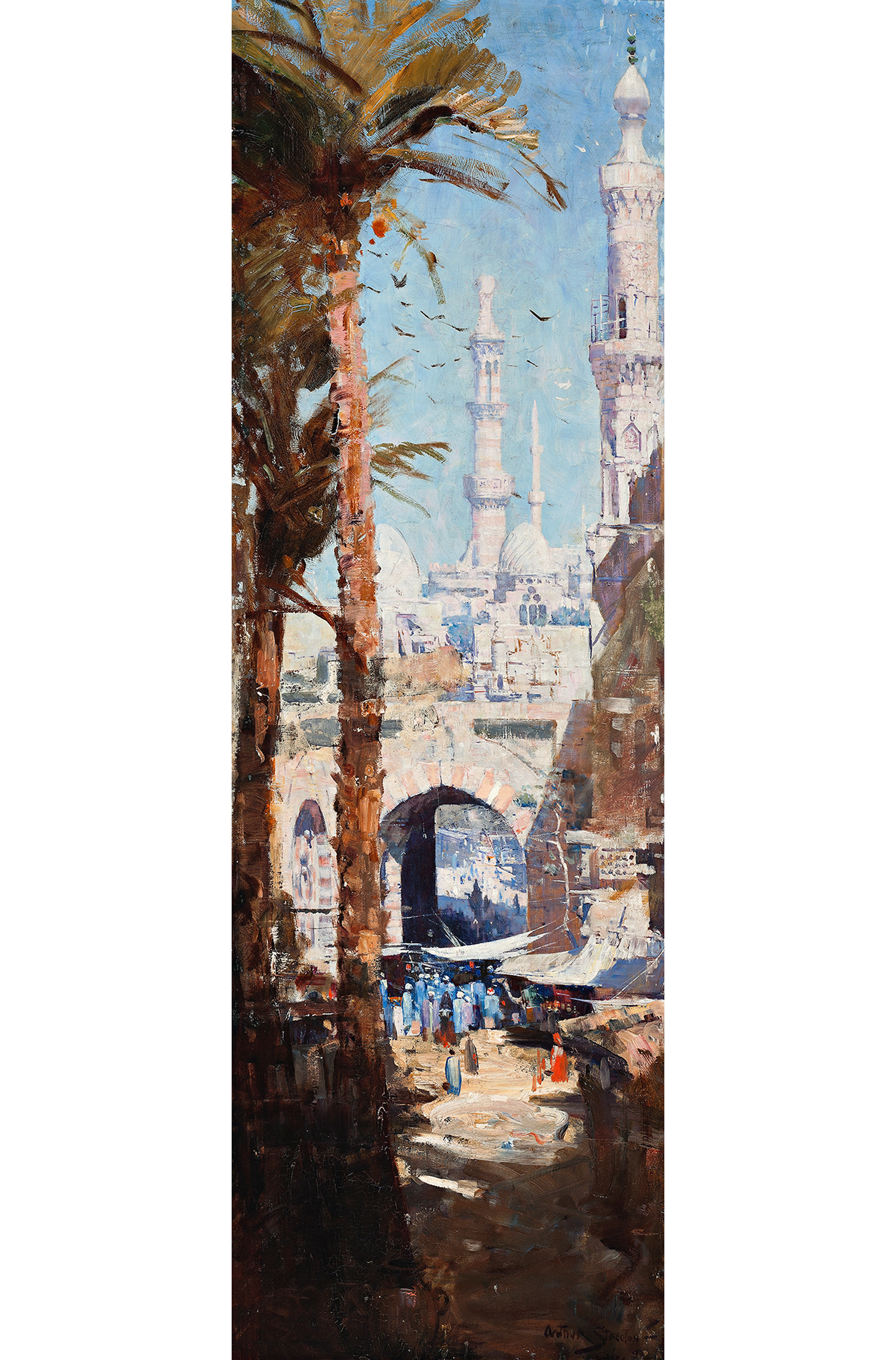 Few of the Cairo paintings trace an actual scene.4 Minarets, Cairo wilfully disregards the conventions of a tourist memento, indeed, its confusion of the facts was bound to irritate any Orientalist who put a premium on accuracy. Whereas some details are broadly characteristic of Cairene architecture, others identify a well-known tourist site. Thus the relief within the arch to the left of the gateway is specific to one of the three main gateways in the walls of the old city: the Bab Zuweila. The minaret on the right of the picture could be one of the pair that rise above that gateway yet its partner is conspicuously absent from the image. The triple-storeyed tenement above the gateway did not belong to Bab Zuweila at the time of Streeton’s visit: some of his drawings showed the gateway as it then was, yet he chose to ignore what he knew to be fact. Likewise, the forms and detailing of the picture’s three other minarets and the domes are not from the vicinity of Bab Zuweila. The ridged pattern on one of the domes (‘borrowed’ from the madresa-mausoleum Amir Iljay al-Yusufi in another part of the city) was perhaps introduced by Streeton because its swirling lines assisted the upward movement he sought to convey in the painting.