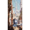 Of the memories Streeton cherished to the end of his life, his sense impressions of Heidelberg and the camp at Sirius Cove had been central to his visualisation of those places. Cairo, too, held for him the luxury of an immersive experience. Minarets, Cairo is a potpourri of sense-impressions. The brushwork, gathering impressions, has the performative rhythm of an act of recall. By touch it animated, alike, the heavy ashlar foundations of Cairo and the flickering motion of birds in a blue blaze of sky. Stroke by stroke Cairo’s vertiginous street architecture was rebuilt in terms of colour, light and texture. From a ground teeming with people the scene lifts and circles into light via the round arch of a vast oriental gateway and successive upward steps of flimsy tenement houses, the curves of white domes, arrowing lines of tall minarets and impossibly tall palm trees. The life of the picture is in the cumulative brushstrokes, each distinct, square, and as palpable to the eyes as an actual touch: the memory here may be the constant touching of his person by Egyptians which had so jangled his nerves and oppressed his mind in Cairo! Without relinquishing illustration, the painting steered towards expressive abstraction. Movement and the overall direction of the people in the street is suggested partly through a simple repeated element of blue-clad figures and partly by a scrawled line of white paint in the direction of the gateway. Cloth awnings strung over the street have been tailored to resemble the lateral mark of a slashing stroke of the brush. Dots and dashes of colour describe palm branches, fruit, and birds.