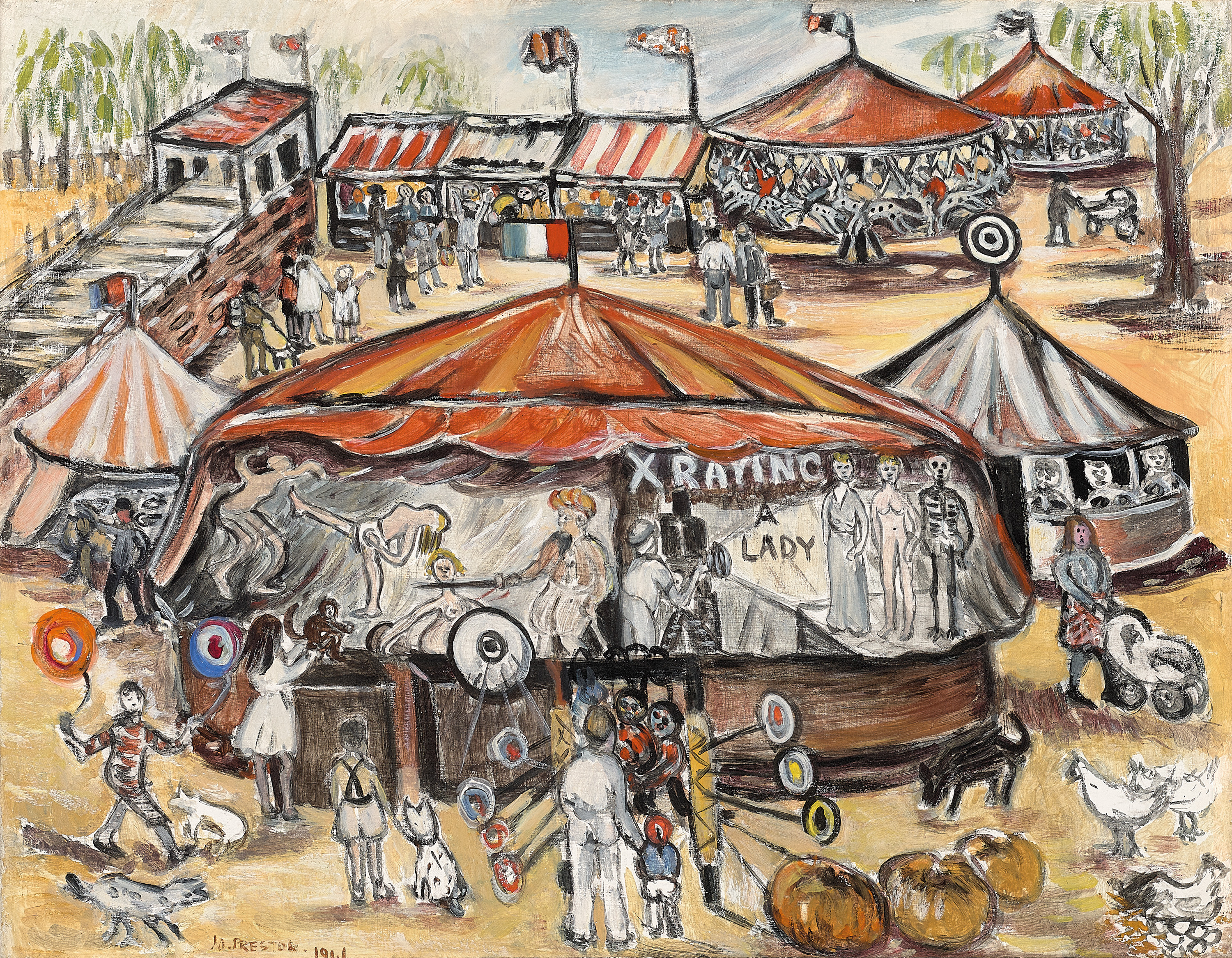By early 1946, most Australian troops had returned home following the cessation of hostilities, and a number of events were organised in celebration, particularly in regional centres. In Molong, located on Wiradjuri lands near Orange in New South Wales, the town organised a ‘Victory Show’ to be held on a holiday weekend in early April, before the more sombre commemoration of Anzac Day. Sited along the Euchareena Road, The Molong Express and Western Districts Advertiser described the crowd as an ‘Atlantic tidal wave’ as they descended on the show, with some 3,500 entries recorded over the three days.3 In Molong show, Preston focuses on the sideshow alley, with its X-ray demonstrations, vaudeville artists, laughing clowns, merry-go-rounds, and a troupe of performing monkeys – one of which perches on the hand of the small girl at lower right. Many of the exhibitors had participated at the Bathurst show the previous weekend and would no doubt continue to travel to similar shows across the state as the year progressed. In a similar manner to Japanese submarine exhibition, Preston again employs a faux naïve approach, but the tone here is celebratory, in marked contrast to the cynicism of the earlier work. Of the handful of war-related paintings by Preston, most are now in the collections of major institutions with Molong show being a rare example still in private hands.