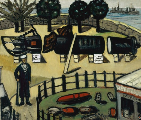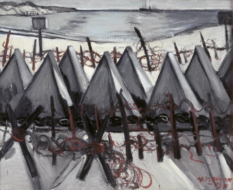 The initial painting of the series is Japanese submarine exhibition, 1942 (Art Gallery of New South Wales) which depicts the authorities’ hastily built display of the wreckage from one of the midget submarines that attacked Sydney Harbour in May 1942, killing 22 people. Posed like a clumsy sideshow exhibit, Preston emphasised the signs warning ‘Do not ask questions’, a stark contrast to Preston’s own attitude to art and life. She also adopts a faux naïve style reminiscent of both folk and children’s art, each of which were of interest to modernist artists at the time. Preston’s indignation towards war-based intellectual hinderances underpinned her rendering of the barricaded General Post Office, Sydney, 1942 (Art Gallery of South Australia), and the impenetrable maze constructed on Narrabeen beach, seen in Tank traps, 1943 (Mornington Peninsula Regional Gallery). Utilising a reduced Indigenous palette of black, brown and ochre, these paintings are also some of the most concise socio-political commentaries produced in Australia during the War.