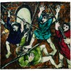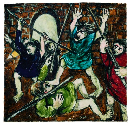 The atmosphere at AMB Pottery was boisterous, filled with friends and family members working alongside the artists, a joyously chaotic environment captured by Perceval in such paintings as The pottery, 1948 (Deutscher and Hackett, 4 May 2016, lot. 10). Concurrently, Boyd was also painting significant works such as The mockers and The mourners (both 1945), parts of a cycle of Biblical paintings infused with the character of northern Renaissance artists, particularly Rembrandt and the earthier, rambunctious Pieter Bruegel the Elder.2 Similar imagery began appearing on the surface of the Murrumbeena ceramics with Boyd using the shapes of the vessels as creative stimulus for the sinuous lines of his brush. The artist’s fascination with Biblical stories started with his grandmother reading to him from an illustrated bible, ‘the tinted engravings in the text being as marvellous as they were bizarre.’ 3 It was these myth-legends that informed the narratives of the tiles, and as the series progressed, Boyd experimented with an increased darkness to his backgrounds, a tactic which ‘projects the figures forward – they often fill the pictorial field in height – in sharpened dramatic confrontation.’ 4 The money changers uses the tale of Jesus expelling the cashiers from the Temple (which appears in all four Gospels of the New Testament) as a starting point only, imagining a subsequent scene when guards have rushed in to subdue the rebel preacher. The fierce struggle between Jesus (identifiable through the symbolic Crown of Thorns in his hair) and the four guards, is anchored by the directional design of the spears, a ‘dominant pictorial rhythm, [allied with] a strong telling and pervading gesture.’ 5