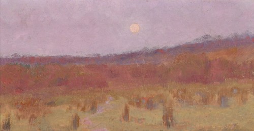 Returning to Australia in 1893 and settling in Templestowe in Victoria, Davies spent the next three years painting his celebrated Moonlight series of nocturnes depicting tonal landscapes near his studio at dusk and dawn. In Moonrise, c.1894 Davies captures the liminal nature of the moon, caught between lightness and darkness, over the paddocks of sparse Australian grassland and tufts of scrub.
