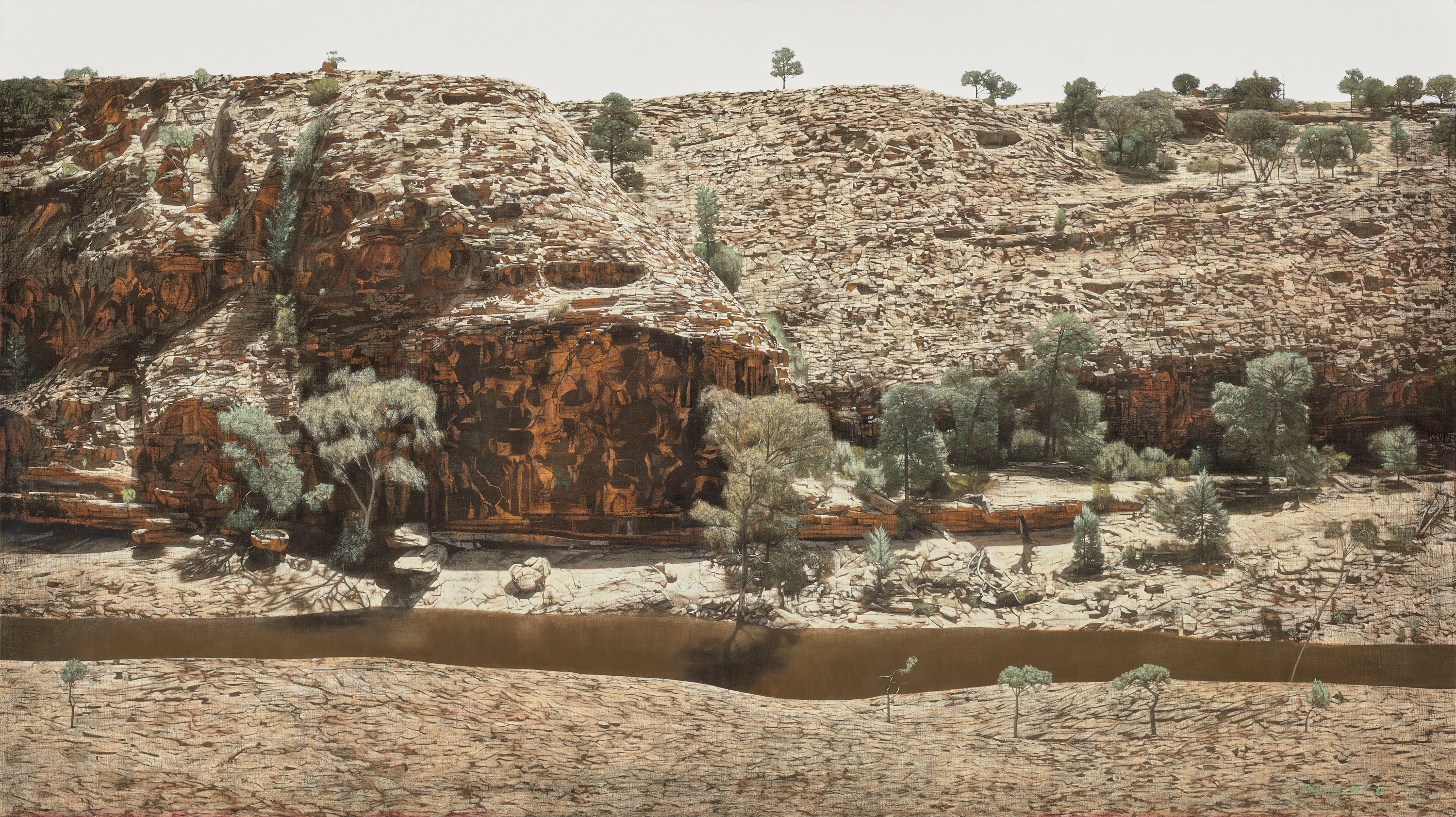 For Delafield Cook, moreover, the site bore particular resonance derived from his interest in the work of Ludwig Becker, an artist and naturalist who had accompanied Burke and Wills on their arduous, ill-fated expedition in search of a mythical inland sea in 1860. As illuminated by the artist – and relayed by art dealer and consultant, Georges Mora, in his letter to then-Chairman of the National Australia Bank, Sir Rupert Clarke, in June 1990 – ‘This (Mottwingee [sic.]) interested me as the place where Bourke [sic.] and Wills stopped en route to the centre and where their artist Ludwig Becker did at least two versions of the same subject: one in watercolours, the other, I think, a pen and ink drawing… I made the trip as part of an overall project I had some years ago to re-visit places that artists have been interested in – lots of Von Guerard of course – The Becker things are especially poignant in that he did not survive very long after doing these drawings…’9 A powerful, mysterious image, Mootwingee offers a recreation of this sacred landscape that is so utterly still and elemental, it seems beyond time. Notwithstanding its ostensible neutrality or stark emptiness, the landscape is informed rather by exquisitely rendered incidents – both small and large, including rocks, stone, branches, tracks – while the vast amplitude of the excavated rockface is conveyed through the painting’s panoramic scale; as Delafield Cook suggests, ‘…it brings in this element of having to turn your head to take in the picture which fills the field of vision, like being there.’10