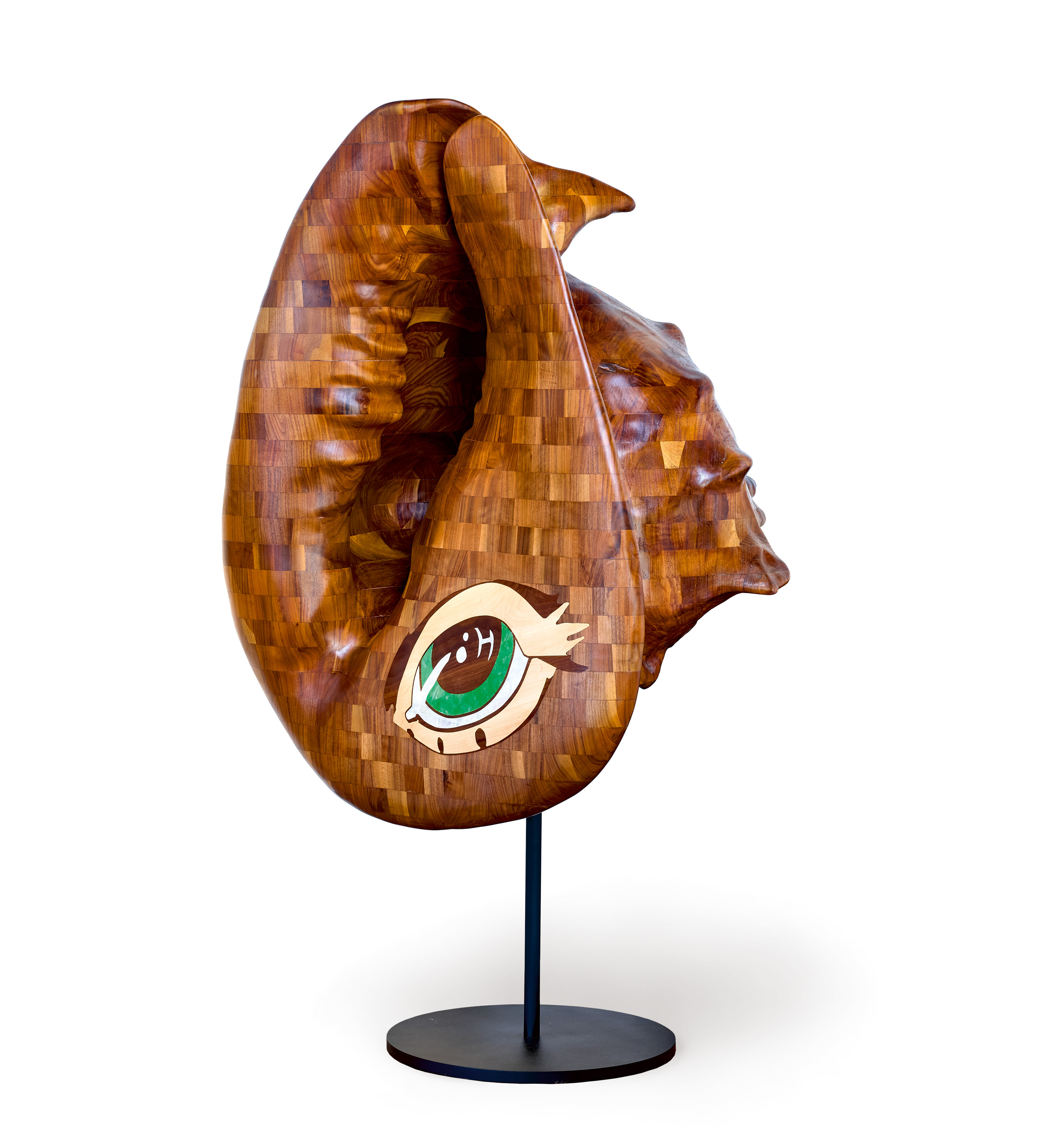 Following the success of this first collaboration with specialist building company, Élan, the multidisciplinary artist revisited the project several years later to create a sumptuous suite of three smaller solid timber shells: the queen conch, the nautilus shell and the spider conch. More The Her, 2022 copies the 3D-mapped form of a queen conch from the artist’s personal collection (a gift from her late mother), finely crafted with horizontal slices of American Black Walnut, with an inlaid stylised eye, made from contrasting tranches of ash, maple and two different tones of mother of pearl.