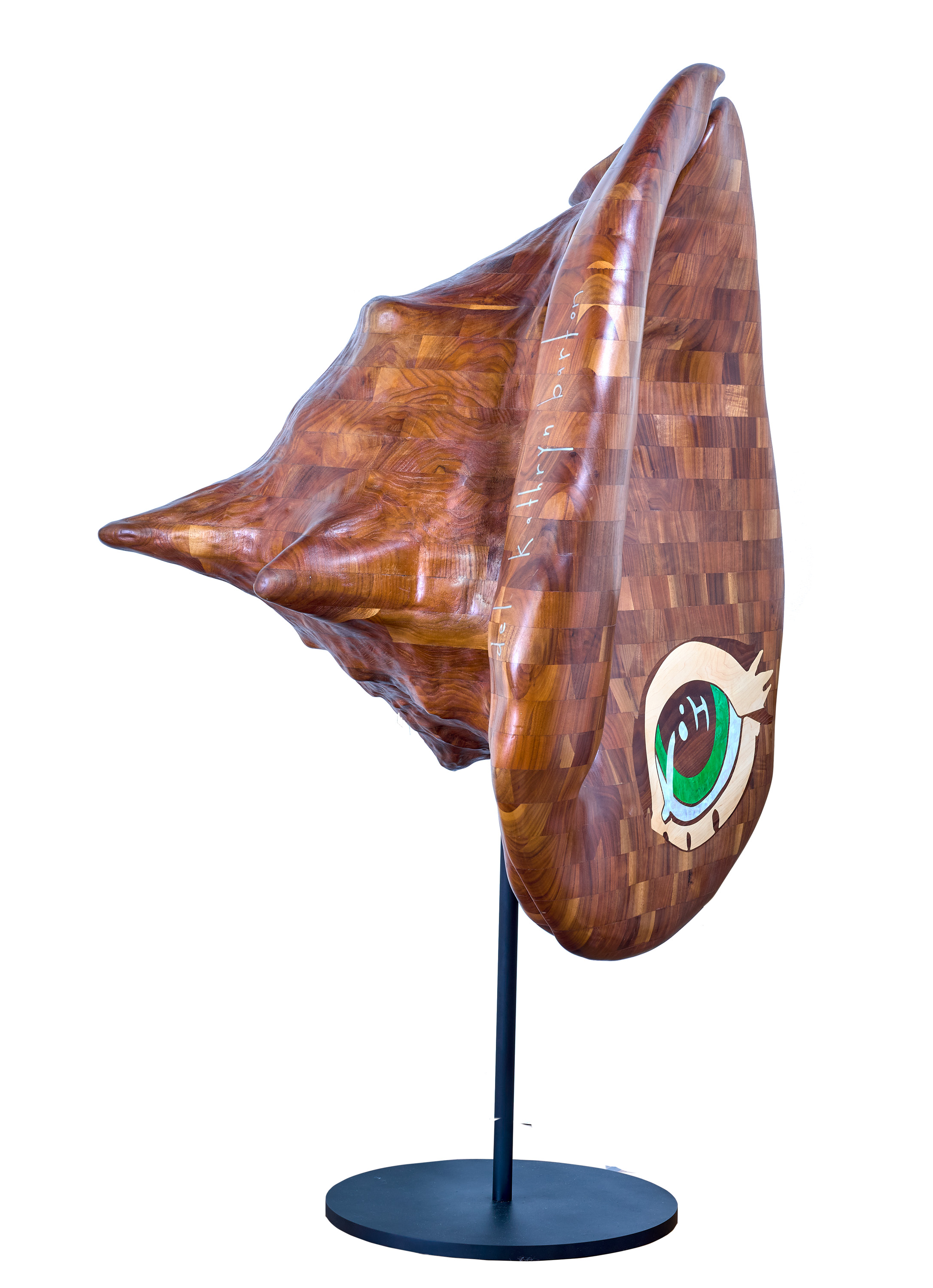 The technical prowess and master craftsmanship provided by Élan allowed Del Kathryn Barton’s richly imaginative world to expand beyond the two dimensional surface of the canvas, mimicking the minutiae of her vision in a tangible, volumetric form. Beyond the butcher’s block chequerboard surface, the motif of a single eye, rendered here with vibrant green abalone pearl inlay demonstrates the translation of the artist’s signature meticulousness and sumptuous surfaces into manufactured large-scale sculpture. Even the inscriptions are lettered with inlays of mother of pearl. Tragically, the charismatic master joiner Boris Tosic, the fabricator and first owner of this sculpture, died prematurely shortly after the three sculptures were exhibited at Barton’s exhibition The Women Who Fell to Earth, at Roslyn Oxley9 Gallery mid-2022. The ambitious, multiple editions of each of these shells were never to be completed.