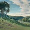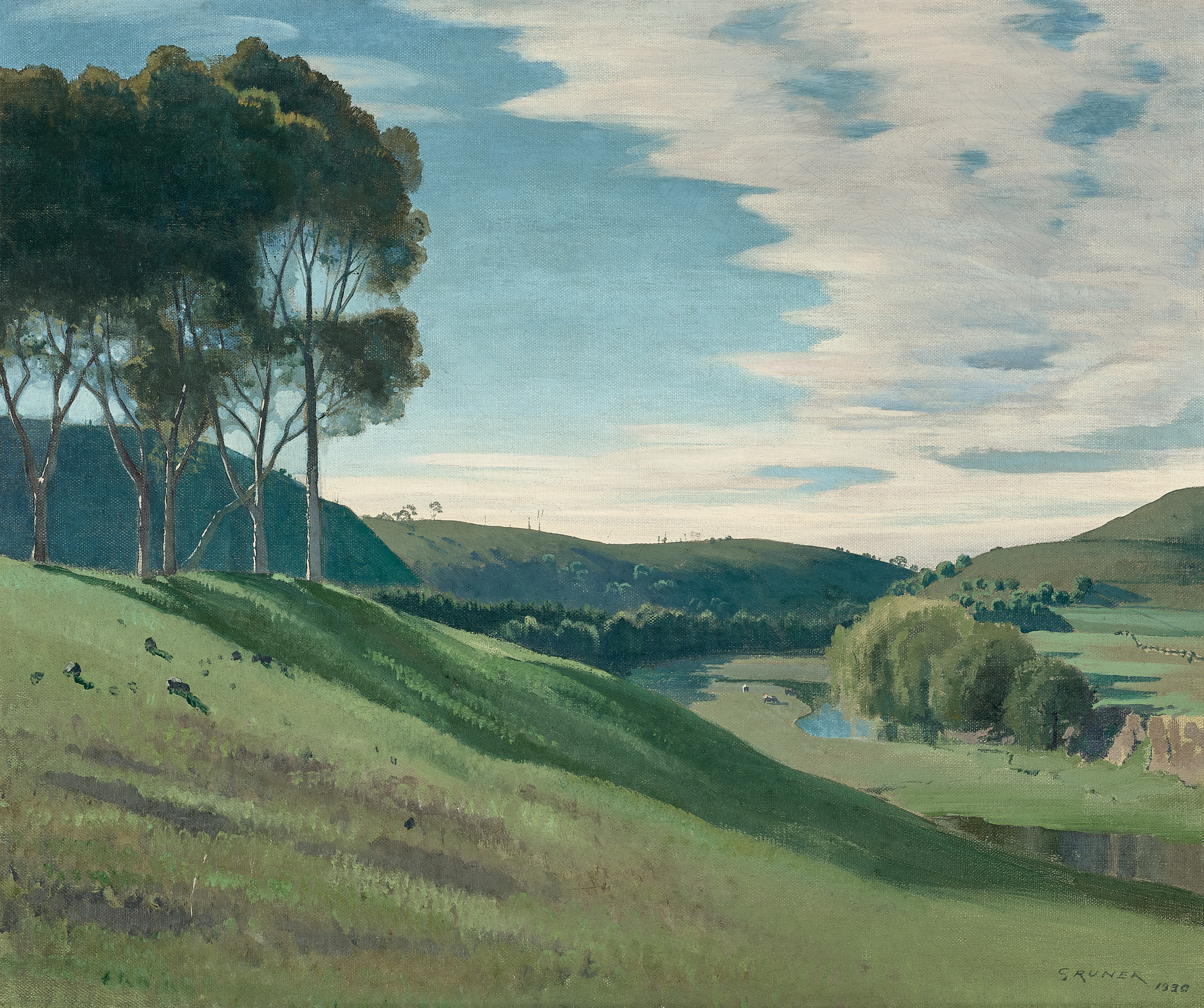 In the June 1930 edition of The Home magazine, it was announced that ‘Elioth Gruner, who has been painting in Victoria, has been sketching with George Bell and Darryl Lindsay in the Bacchus Marsh district.’1 Gruner was midway through an epic road journey that had taken him from Sydney down to Gippsland, and would subsequently include Adelaide before his return to Sydney in August. He was already one of Australia’s most celebrated landscape artists but was also notable for his considered response to new ideas concerning art, one result of which was his exploration of a mannered form of modernism since the mid-1920s. The fact that he was now painting alongside two well-known artist-peers on Woiwurrung and Wathaurong country in Bacchus Marsh implies that conversations regarding technique and approach would have been high on their agenda, and subtle results of these may be seen in the perfectly composed Morning, Bacchus Marsh, Victoria, 1930.