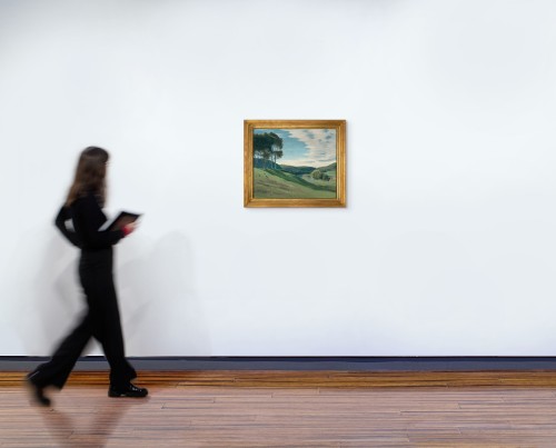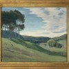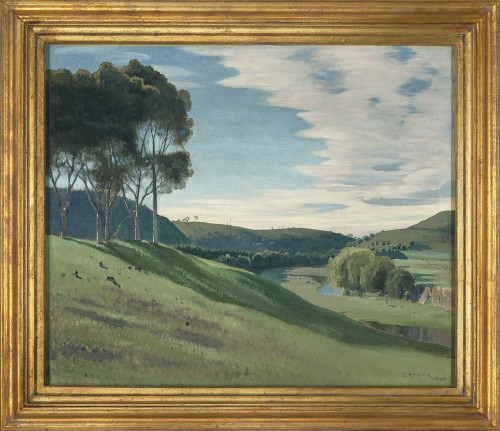Gruner’s great love was light and its effect upon land cultivated by European hands. As a result, the broken brushwork of impressionism had influenced much of his early input with, for example, Spring frost, 1919 (Art Gallery of New South Wales) winning the prestigious Wynne Prize; he would eventually be honoured with the Wynne awards seven times during his career. In 1923, the British artist Sir William Orpen roundly criticised Gruner’s Valley of the Tweed, 1921 (which had also won the Wynne) in front of the artist whilst the painting was on exhibition in London. At first shocked by the encounter, Gruner subsequently travelled to France and began putting some of Orpen’s suggestions into practice, such as a greater emphasis on design, a flattening of forms and a heightening of colour, all of which may be detected in Morning, Bacchus Marsh, Victoria. In January 1930, Gruner’s On the Murrumbidgee won yet another Wynne and shortly after the announcement, he climbed into his Model A Ford and headed for Gippsland. Several significant works resulted including Mitchell River, Victoria (Deutscher and Hackett, 14 September 2022, lot 24) and Valley near Bairnsdale (Deutscher and Hackett, 10 November 2021, lot 47). Journeying further to join Bell and Lindsay in mid-April, he painted Morning, Bacchus Marsh, Victoria, plausibly one of the ‘24 by 20’ inch (50.5 x 61.0 cm) canvases he mentions in a letter to Basil Burdett, describing them as being ‘quite different to anything so far.’2 Of particular note is the powerful and dynamic interplay between the angled bank of clouds to the right and the contrasting copse of trees which counterbalance the soft curves of the hills and river below; such bold sky-versus-land interplays are not prominent in Gruner’s earlier work. In a companion painting done a few kilometres away, Myrniong, Victoria, 1930 (location unknown), he sets a similar bank of clouds to the alternate side, this time echoing the route of a country road. It is these harmonious yet dynamic contrasts which underscore Gruner’s opinion the Bacchus Marsh paintings were ‘different’; indeed, he subsequently wrote to Burdett of his triumphant belief that he had ‘painted a sky at last.’3