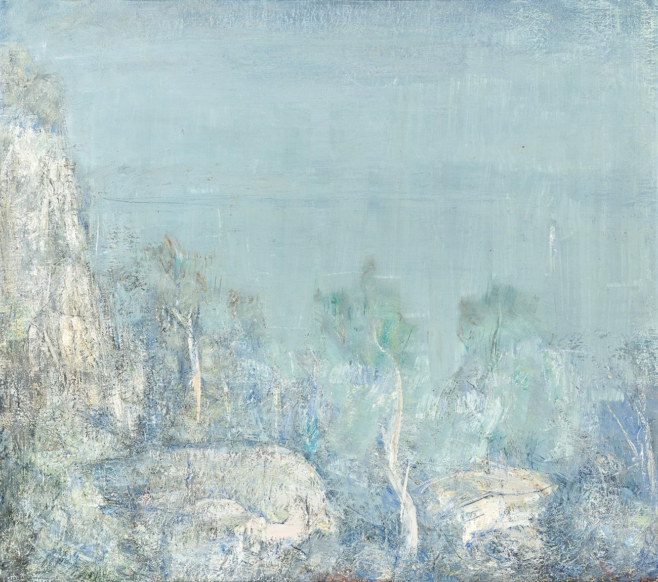 In Tasmania, Rees painted in three main locations, at his son’s house, perched high on Sandy Bay with the Derwent in the distance; in a studio located in the grounds of the university; and at the house of his friend, the artist Jack Carrington Smith, also sited on the river. Due to the relatively low aspect of Morning on the Derwent, 1971, it is probable that this latter location was the site at which it was painted. In a scene enveloped in morning mist (a common Derwent occurrence), Rees has abandoned his usual crisp line in favour of form, with the rocks, trees and distant shoreline all hazily suggested in a teal/azure blue applied using a palette knife highlighted with white. At the time, Rees was utilising his own homemade PVA-based ‘plaster’ to build up a low impasto over which he would paint vigorously or, to use his own words, ‘roughly – attack them, as it were (but) it is from this attack that unity emerges (once) a canvas is well covered with paint’.2 He was always at pains to emphasise that his paintings were never topographically true for although he may begin with an accurate sketch of a scene, ‘painting is a creative process. It is not nature, it is a man-made thing’.3 Rees also admitted that ‘when I enter the studio, a different person seems to take over, the picture on the easel dominates and everything else fades away’.4