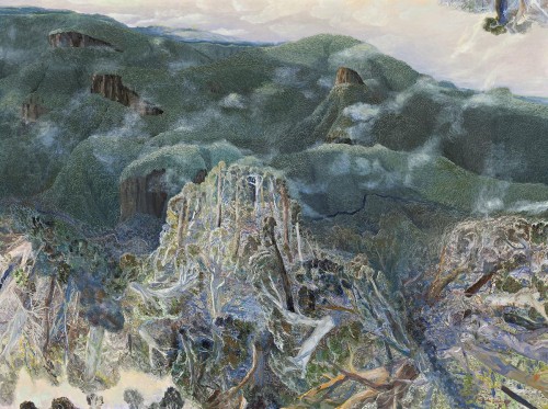 In 1995, James Fairfax gifted John Olsen’s magnificent painting, We are all but Toys of the Mind, 1965 to the National Gallery of Australia. Robinson’s similarly sized Morning Springbrook and West, 1995 took its place and has hung in the hall stairway at Retford Park ever since. It is by any measure an outstanding example of Robinson’s work. The view that Robinson depicts is a panoramic vision which spans millennia. The title of the picture directs the viewer from Springbrook in the north of the Gold Coast hinterland, over granite cliffs toward the west. The breadth of the subject allows the artist to flaunt his skills as a colourist and again he uses his distinctive device of multiple view points within the one picture plain. He also employs vastly different techniques when applying the paint in the major passages of the painting. The meditative application of deep greens and granite greys in much of the composition is used by the artist specifically to depict the ancient features of the landscape and evoke its timeless quality. In the lower half of the painting, Robinson deploys upbeat staccato brushwork, which brings a present day contemporary feel to the picture. The forest of Antarctic beech trees depicted, within the time frame and context of the painting, amount to new growth and the floating clouds passing amongst the hills introduce an ephemeral element to the work, which further presses the notion of time passing.