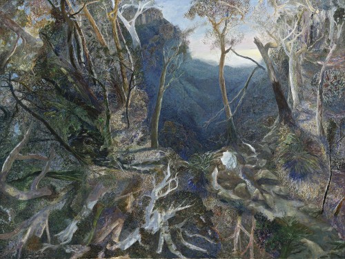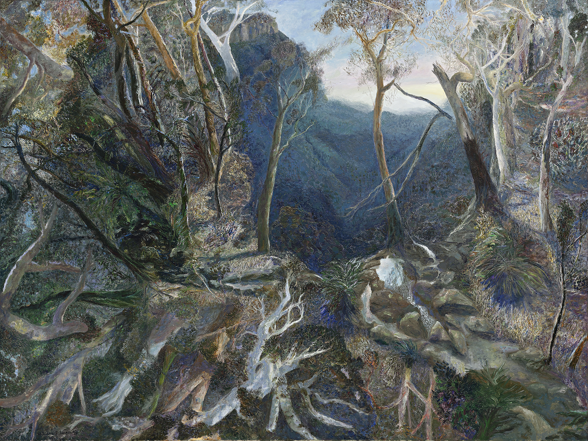 ‘Tallanbanna has both rainforest and eucalypt forest. The spring-fed creeks fall at Twin Falls and neighbouring falls. This work came after many visits where I walked and observed; and at other times I made studies of trees and the undergrowth. All my paintings are painted under a great deal of light, including daylight. They are best seen in an equivalent amount of light. I make a great deal of use of coloured greys, which can react subtly with other surrounding colours. I find that the greys mixed from colour can produce a reduction which allows other colours to interact in tone and chrome. In this work, I was continually searching for completeness in composition. Sometimes I will make a window with my hands and move across the complete painting. I was particularly concerned with the placement of trees – particularly those against the space of the sky and valleys. Memory is always very important to me. The actual place itself and nature are the triggering devices. The work is completed in the memory. I find that if memory lacks absolute accuracy, it allows something else to occur in a painting, perhaps something fresh and unpredictable. I feel best when I am painting with a concern for the surface and life of the work. I like working across the surface and making links. I find that it is necessary to have persistence and regular hours of working with little variation from day to day. Walking and observing is done both morning and evening. This is not just for the looking, but for thinking about a painting; not its final image, but rather its feel even in the unfinished state.’1