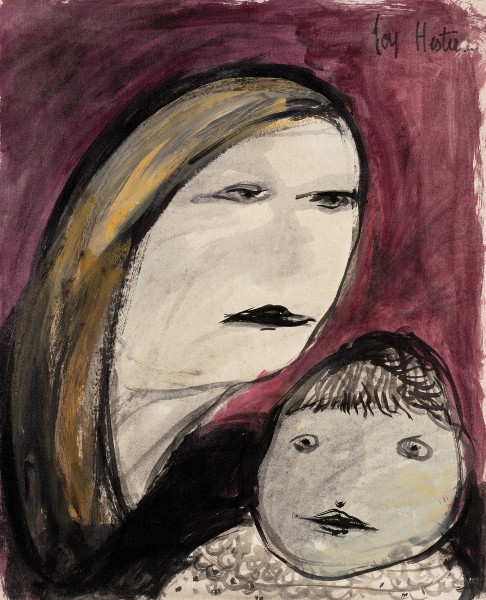 Images of children and of mothers and children feature in Hester’s work of the mid-1950s, years which followed the birth of her son, Peregrine, in 1951, and daughter, Fern, three years later. Major works such as Girl with Hen, 1956 (National Gallery of Australia) and Two Girls in the Street, 1957 (National Gallery of Victoria) – ambitious in scale, finish and in their use of colour – depict the playfulness and innocence of childhood. In contrast, it is the intimacy of a mother’s bond with her baby that is the focus of works like Mother and Child, 1955 (National Gallery of Australia). Two large faces fill the sheet and, like Hester’s images of lovers where figures merge and blend into one, the mother and child are connected, but also retain their individuality. In this work, probably painted around the same time, there is a sense of separation, indicative perhaps of the age of the child, a toddler who is beginning to assert some independence. Characteristically, it combines loose, expressive brushstrokes, a striking use of colour – bolder than many of Hester’s works – and continues her familiar habit of depicting faces without noses.3 For Hester, ‘art existed as an equal in a democracy of love, friendship and children’4 and as this work depicts the profound relationship between mother and child, it also presents a poignant evocation of innocence and experience.