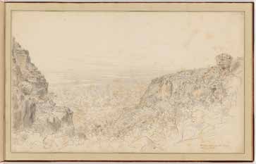 Von Guérard spent four days sketching at Mount Arapiles in October 1868. He had long been aware of the imposing sandstone-quartzite formation that rises from the flat Wimmera Plains north-west of the Grampians (Gariwerd). Known as Dyuritte to its Traditional Owners, the Wotjobaluk, Jaadwa, Jadawadjali, Wergaia and Jupagulk peoples, it was named Mount Arapiles by the explorer Major Thomas Mitchell in 1836.5 And it was through Mitchell’s two-volume publication, Three Expeditions into the Interior of Eastern Australia (1839) that von Guérard discovered it.6 In the 1850s von Guérard made copies of the illustrations in Mitchell’s book, including those of the impressive and geologically significant Mount Arapiles. Then, in 1862, his fellow artist and good friend, Nicholas Chevalier, travelled to Mount Arapiles with their mutual friend, the eminent German geophysicist, Georg von Neumayer. Von Guérard had accompanied them on the first leg of the expedition, to Cape Otway. On his solo expedition to Mount Arapiles in 1868, von Guérard stayed at properties owned by the Wilson brothers –John Wilson at Woodlands, Samuel Wilson at Longerenong and Charles Wilson at Walmer – where he saw Chevalier’s paintings on the walls. At Alexander Wilson’s property, Vectis, he was reunited with one of Chevalier’s most important works, Mount Arapiles and the Mitre Rock 1863.7 St Mary’s Lake Station, a property managed for Wilson by Mr McDonald and close to Mount Arapiles, was von Guérard’s base for four days sketching on and around the mountain.