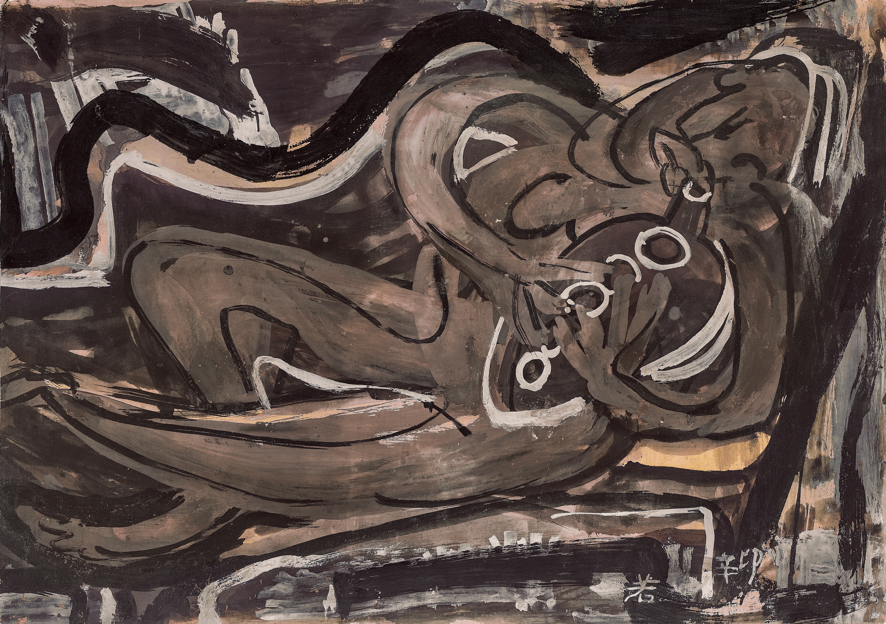 Fairweather: a retrospective exhibition, Queensland Art Gallery, Brisbane, 3 June – 4 July 1965; Art Gallery of New South Wales, Sydney, 21 July – 22 August 1965; National Gallery of Victoria, Melbourne, 9 September – 10 October 1965; National Gallery of South Australia, Adelaide, 26 October – 21 November 1965; Western Australian Art Gallery, Perth, 9 December 1965 – 16 January 1966; Tasmanian Museum and Art Gallery, Hobart, 10 February – 13 March 1966, cat. 26 (as ‘Reclining Figure, about 1953?’)