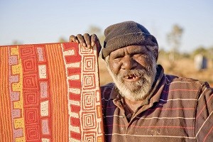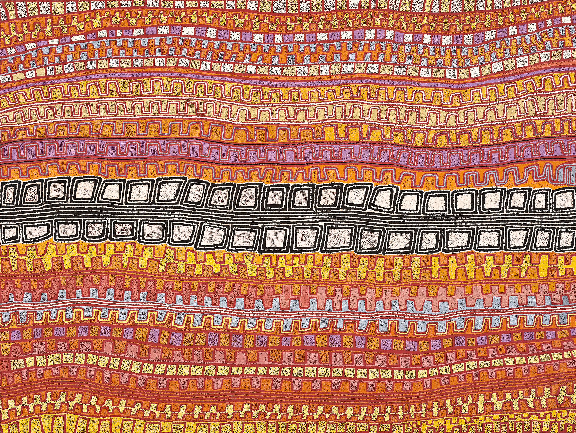 As the men travelled they drank from various water sources found amongst the rocky outcrops. These rockholes and soakages are represented by the concentric squares running through the middle of the painting. The jagged lines represent rain making designs that were painted onto men’s bodies for ceremonial purposes.’