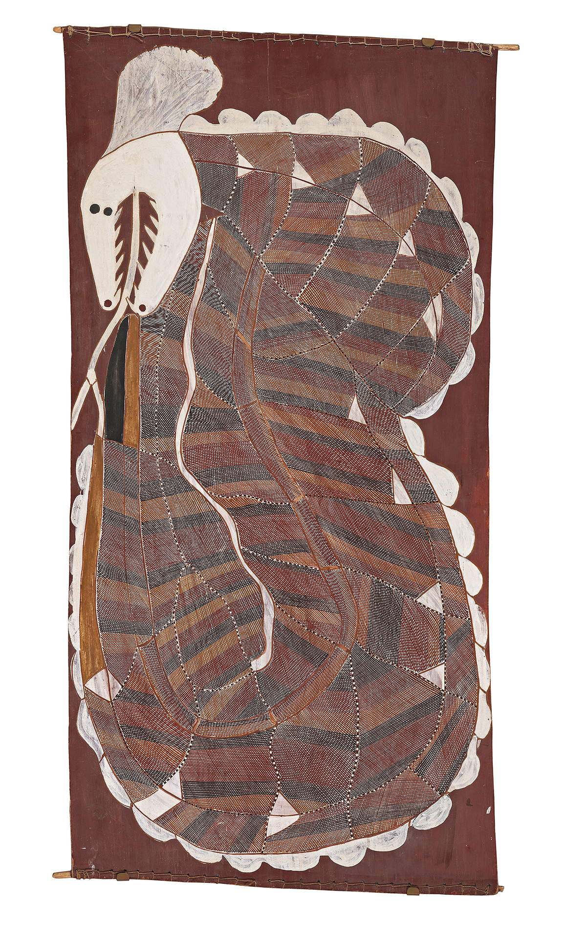 This work is accompanied by a certificate from Maningrida Arts and Crafts which states: ‘NJALJOD – The Rainbow Serpent. The Rainbow Serpent occurs as a highly-important figure in the mythology of many Aboriginal groups. The nature of NJALJOD is in some myths male or neuter, while in others it is specifically female. The ‘mother one’ Rainbow Serpent is most often associated with an increase of species. As well as being bisexual, depending on the site, NJALJOD can be regarded as either belonging to the Dhuwa or Yirritja moieties. It can be benign or highly-dangerous. Some sites are tabu (sic), except for elders to approach; other sites may even be favourite hunting or swimming places. Only clever men (marrgidjbu) can see the Rainbow Snake in his dreaming places. The Rainbow Serpent can still take other forms sometimes appearing as a buffalo or kangaroo... a clever man will see past this disguise.’