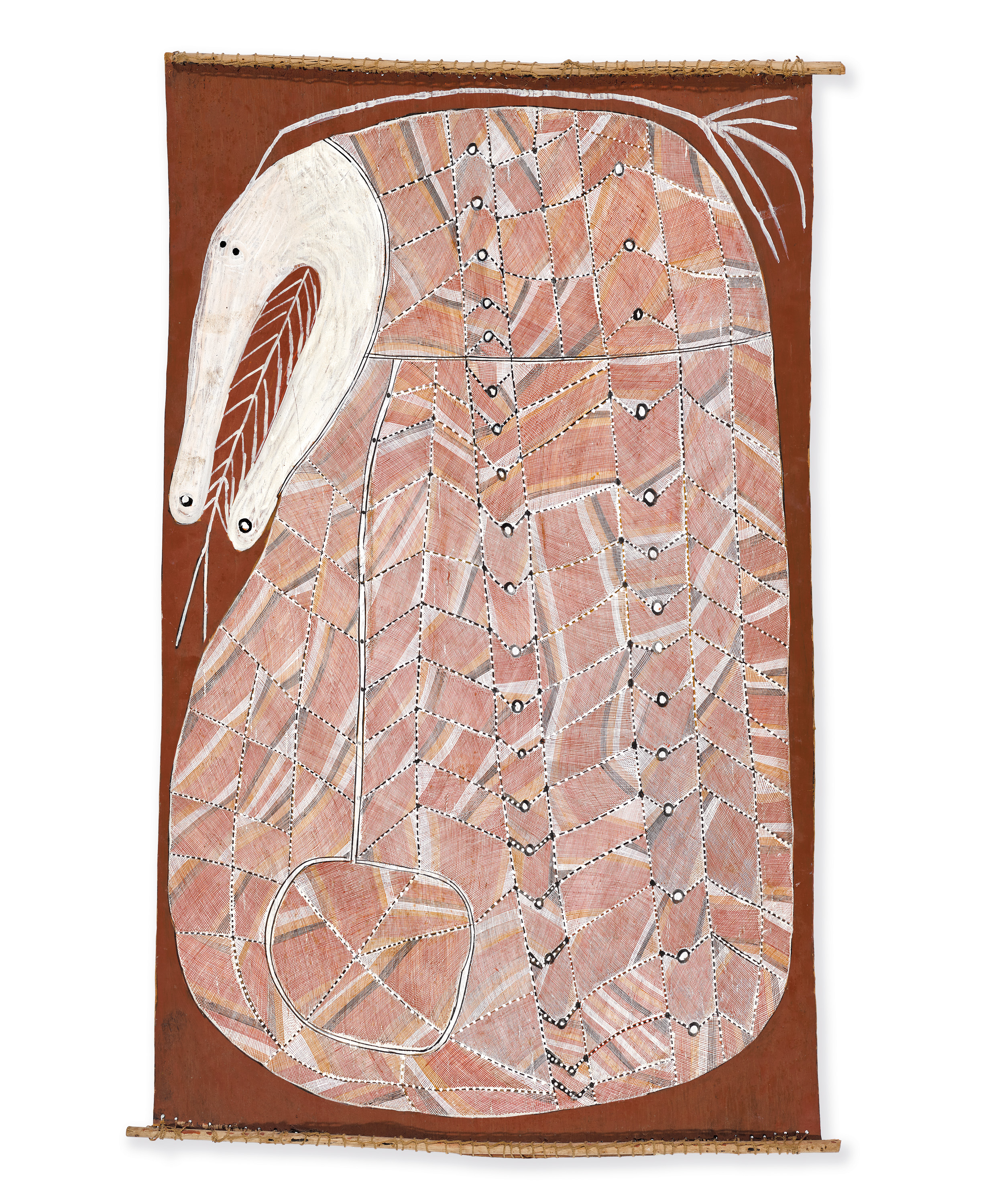 Since he first began painting in the late 1970s, Mawurndjul has quietly transformed Kuningku bark painting. His early works of figures and creatures in Kuningku mythology evolved into a more metaphysical representation of specific sites, events and landscape that serve as a link between the spiritual and human worlds. However, it is in his renditions of Ngalyod, The Rainbow Serpent that this evolution is most evident. An omnipotent and significant creature in Kuninjku cosmology, Ngalyod is associated with the creation of all sacred sites, djang, in Kuninjku clan lands.