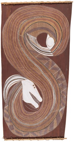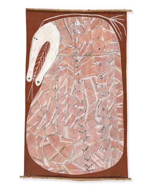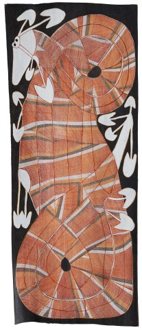‘I always thought about Ngalyod and how to paint it… In [early] pictures I use dot infill like the old people, but now I have changed, I have my own style, my own ideas, you don’t see dot infill anymore… I went and painted bigger barks… Ngalyod is very powerful and dangerous... I paint her from my thoughts.’2