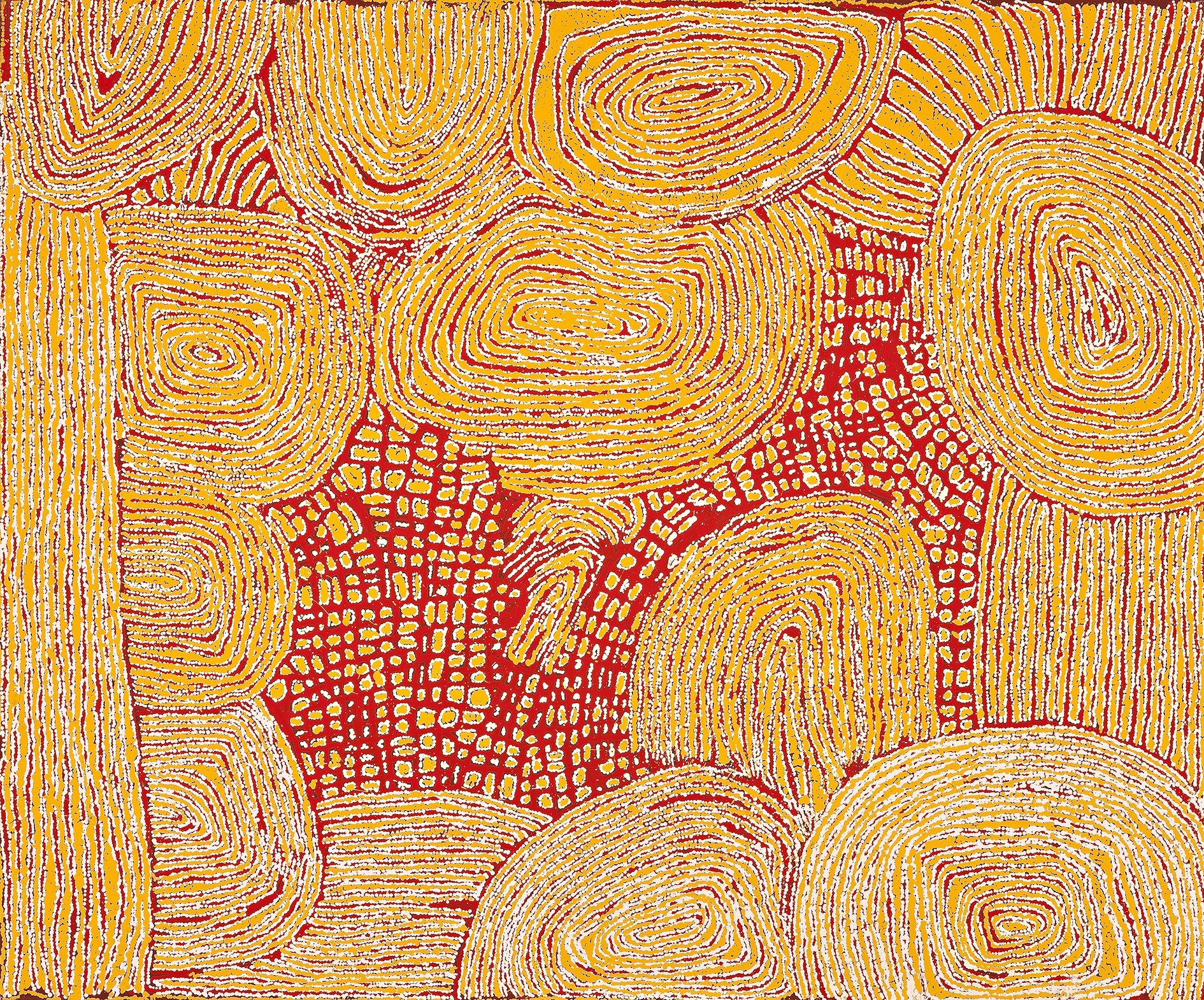 This painting is accompanied by a certificate of authenticity from Papunya Tula Artiststhat states: ‘This painting depicts designs associated with the rockhole site of Ngaminya, just to the south-west of the Kiwirrkura Community in Western Australia. During mythological times a group of ancestral women camped at this site gathering the edible berries known as kampurarrpa (desert raisin) from the small shrub Solanum centrale and pura (bush tomato) from the shrub Solanum chippendalei.