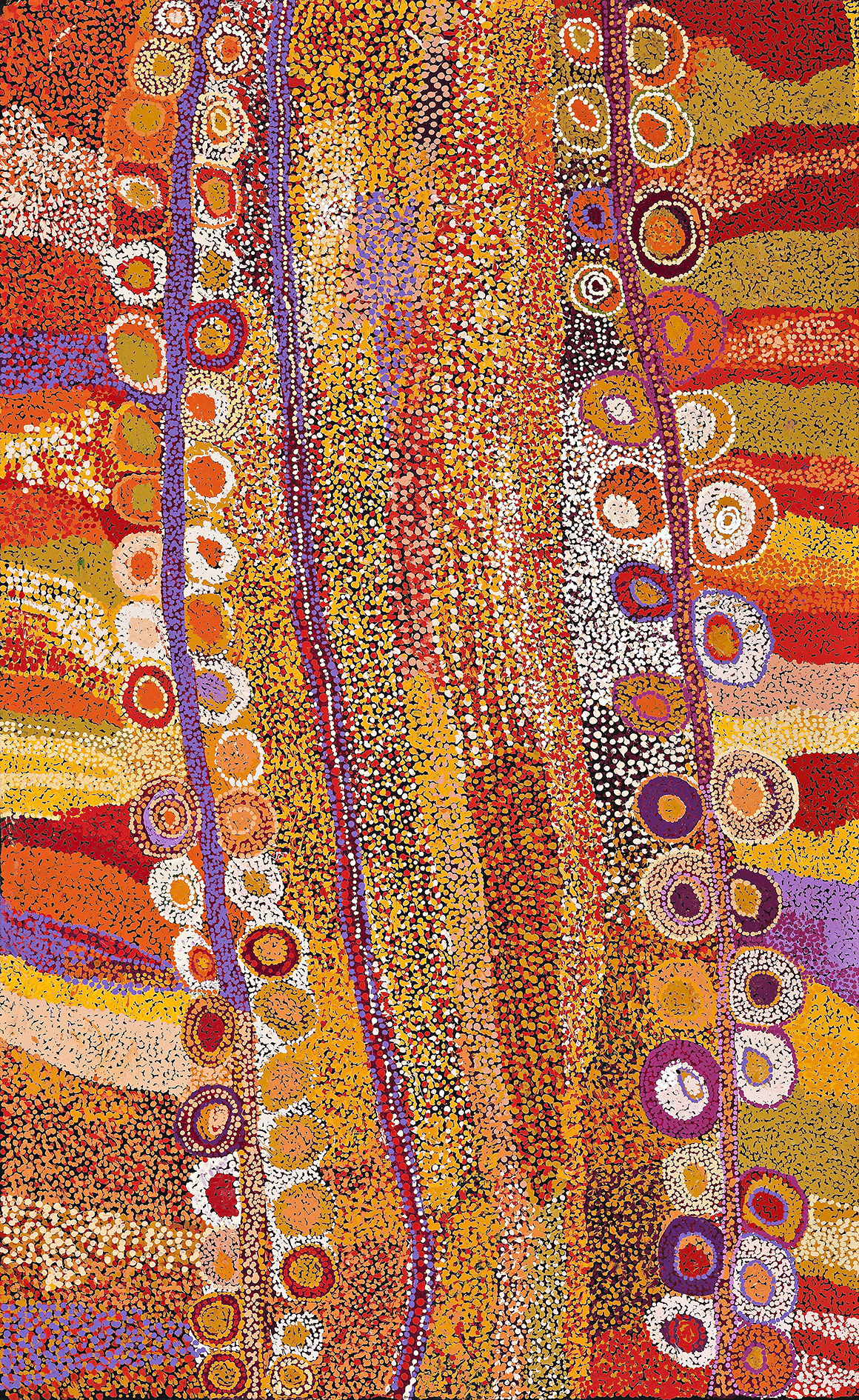 This work is accompanied by a certificate from Tjala Arts which states: ‘In this painting Wawiriya has depicted her country. The different colours and designs represent variations in the landscape.’