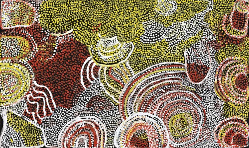 Antara is a special place for Milatjari. She always paints this country and Maku Tjukurpa. The Maku Tjukurpa (witchetty grub songline) is a significant songline for this area. The women from Mimili would go to the waterhole north of Mimili. They would clean it out then wait for the rain to come. When the waterhole was full of water they would tap the water’s surface and sing inma for Makutjuta (enough water for everyone). The rockholes, hills and country are depicted in this painting.’