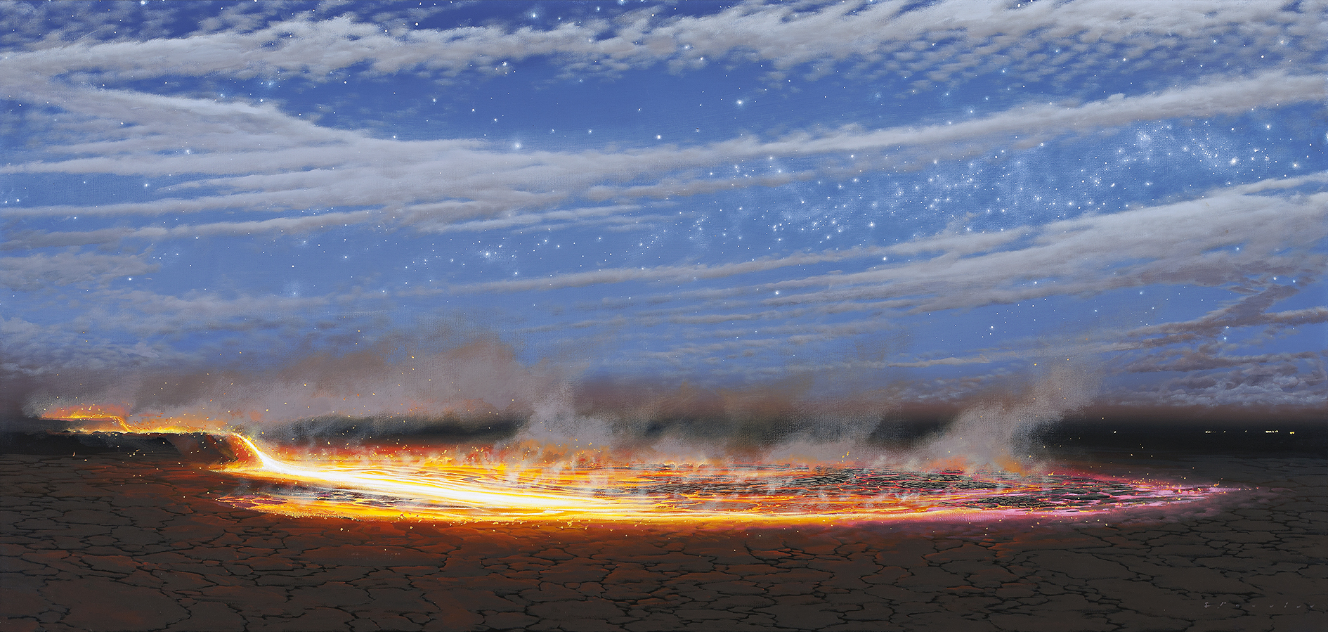 The Night (Chrome Tap), 2008 is a unique painting in Tim Storrier’s oeuvre, presenting a subtle variation on the painter’s renowned scenes of blazing ropes and glowing embers, each set against an expansive natural backdrop. In the late 1990s, the thematic progression of Storrier’s practice led to an exploration of the four classical elements of earth, wind, fire and water, the seeds of which were already apparent in his earlier works. Pre-scientific concepts historically used to explain the physical complexities of matter in ancient cultures across the world, Storrier returned to these ideas to reveal the indomitable nature and awesome power of the natural world, captured in fleeting moments of transformation, destruction and regeneration. The Night (Chrome Tap) was commissioned specifically for the collection of an Australian mining and mineral processing company. In honour of this commission, Storrier introduced a fifth element into his repertoire, shown here in all of its molten potentiality – metal.
