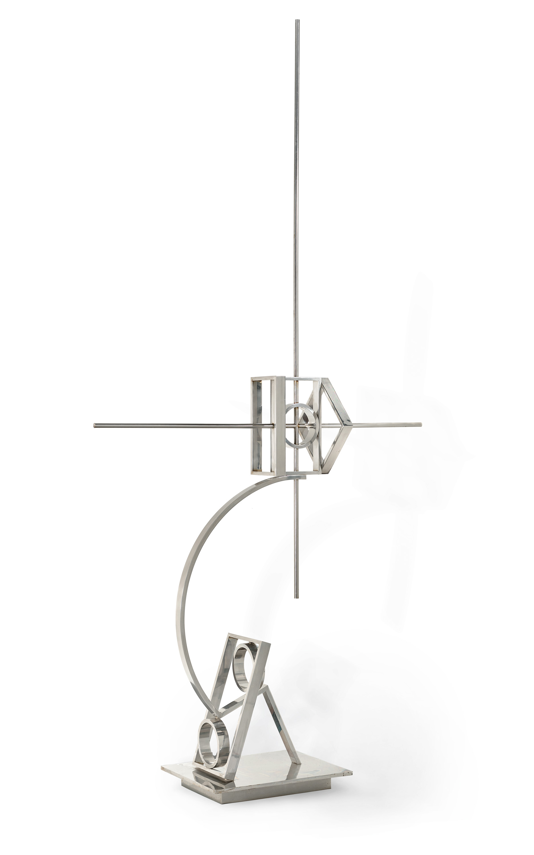Although the loss of human touch was a concern for Klippel in the initial stages of fabrication, in No. 274b, the technical perfection of an industrial finish and spartan discipline of its geometric construction dovetailed to create a masterful sculpture. While governed by static straight lines and right angles, save for wide arced segment for the foot, the arrangement of Klippel’s guiding lines invokes careful movement. Perhaps providing the impression of a gradual alignment of each part working in tandem to provide focus and clarity? Gleeson provides a clear assessment of the merits of this sculpture in his 1983 monograph ‘cool as an equation and loaded with the authority of logic, it stands in complete mastery of its space. It is undeniable as a theodolite or an astrolabe.’1