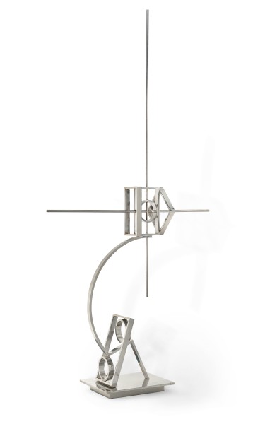 Exerting his creativity with a new formal vocabulary, no longer reliant on the found forms of industrial and mechanical detritus, Robert Klippel’s constructions of early 1970s were meticulously drawn in space with a strict rational syntax of right angles, perfect circles and squares in graduated sizes, arranged and assembled in brazed steel. The high formalism of these works demonstrates the continuity of these aesthetic concerns throughout Klippel’s oeuvre. While several examples of this suite were monumental in feel despite their modest size, such as No. 266a (lot 3), these became the first, and only, sculptures for which Klippel created industrially produced enlargements. No. 274b, 1974, striking in its refined rectilinear severity and gleaming clean edges, is the most successful of these enlarged geometric sculptures, with both versions acquired for the collection of Richard and Joan Crebbin, Klippel’s consistent patrons.