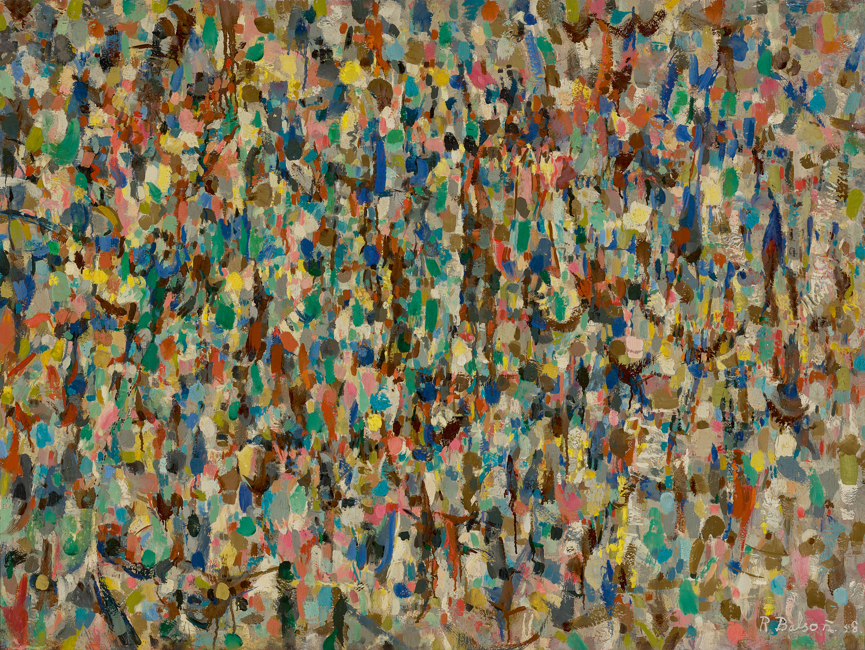 This Non-Objective Painting represents a vision of the infinite through a complex and vibrant web of layered staccato marks. With a wide variety of brushstrokes, Balson has distributed the colours throughout this composition with the utmost care, associating unexpected colour variations and variating brushstroke orientation to create a delicate vibrating motion. With no clear focal point, the marks of the finely mottled surface coalesce in the centre and dissipate towards the edges of the support. The eye is drawn around the painting, attracted by joyful and bold tonal associations, such as stippled highlights of white, cobalt and cadmium red, or dashes of burnt umber subtly dripping beneath lighter and brighter daubs. Non-Objective Painting is a superb example of Balson’s impressionist and increasingly gestural interpretation of the underlying fabric of the universe.