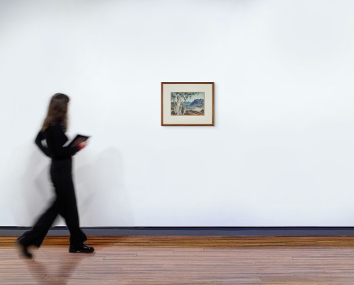 Painted in the final years of the artist’s life, and typical of Namatjira’s later works, North Gully Looking to Mt Gillen, Alice Springs, c. 1955 – 57 is an exemplar of the artist’s recurring motifs. Located in the foreground, a majestic ghost gum (Eucalyptus papuana) – known as ilwempe to the Western Arrernte – frames the view to the abrupt slopes of Akngwelye (Mount Gillen) in the middle distance and out to the distant peaks beyond. ‘Namatjira’s familiarity with this country is evident in these views where trees, peaks and monoliths provide a rich range of possibilities and responses that arise from constantly re-engaging with the same subject.’3