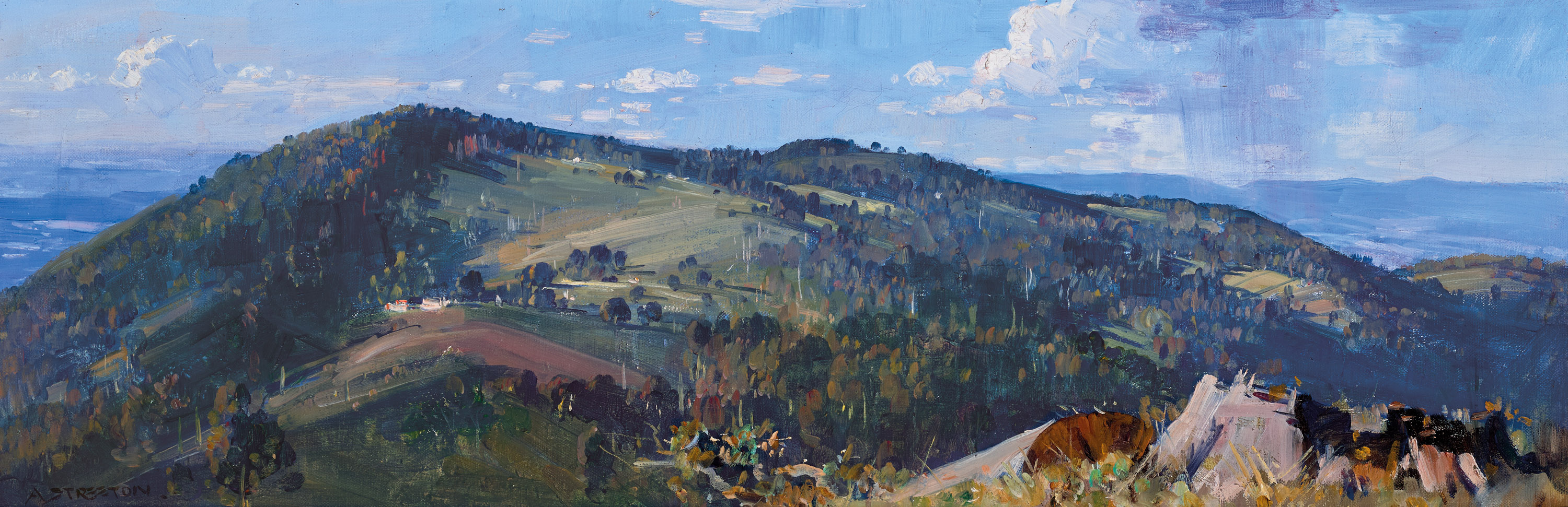 Presenting an expansive panoramic vista, Northern view, Olinda, 1933 looks from a high vantage point across to a nearby hill-top – densely treed, apart from a large central clearing – and the distant landscape beyond. Streeton places us in the landscape in this picture, and close to the sky, which is pale blue and scattered with clouds. Delicate vertical brushstrokes of purple on the right-hand side describe a rain shower in the distance, suggesting direct observation of the subject. The key to this image however, is the large felled tree in the right-hand corner. It is a subtle, yet powerful inclusion, the girth of the tree trunk signalling its age and symbolising the scale of the loss it represents. The strong environmental stance Streeton adopted in these works did not discourage serious collectors, indeed, it may well have encouraged buyers who both appreciated his artistic skill and shared his progressive opinions. The first owner of A mountain side, 1935 (Westpac Banking Corporation), for example, was Sir George Coles, founder of G. J. Coles & Co. retail stores. Similarly, Alfred Nicholas, who famously produced aspirin in Australia under the name Aspro, purchased The vanishing forest, 1934 (private collection) from its first exhibition. Northern view, Olinda was purchased from Streeton’s 1933 exhibition at the Athenaeum Gallery, Melbourne by Mrs Annie Ramsay (1871 -1953) and has remained in the family ever since. While her name is comparatively little known in the context of early twentieth century business figures, from 1923 – 33, she was the chairwoman of the Kiwi Polish Company, which had been founded by her husband, William (1868 – 1914). Indeed, it was her New Zealand heritage and nickname, ‘Kiwi Annie’, which inspired the name of this iconic Australian brand.4