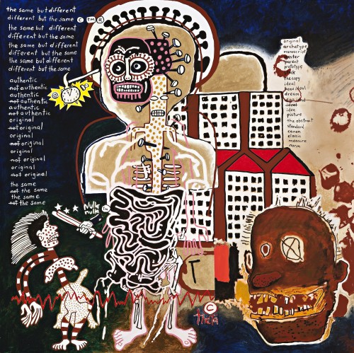 Accordingly, in the present Notes to Basquiat: (Ab)original, 1999, the experience of race and life generally in the northern and southern hemispheres is both differentiated and conflated through Bennett’s highly sophisticated mimicry of Basquiat’s spontaneous urban style. Anchoring the composition is a confronting tortured skeletal figure, that embodies a shared stereotyping of ‘blackness’, yet more universally suggests a common humanity – that beneath one’s skin ‘we are all alike underneath’. Such is reiterated by the work’s unfolding lines of text ‘the same but different / different but the same’ – a notion which not only reverberates throughout the entire series, but is similarly reflected in Bennett’s knowing relationship to Basquiat and his practice. Ultimately betraying Bennett’s highly idiosyncratic vision however, is his characteristic engagement of the viewer here through his thesaurus inspired word-play designed to activate the complex web connecting sight, speech and thought, and thus highlights the links between history and meaning established in his oeuvre. Deliberately inconclusive – ‘original’, ‘archetype’, ‘manuscript’, ‘master’, ‘parent’ etc – Notes to Basquiat: (Ab)original eloquently attests to the compelling possibilities offered by Bennett’s art and its embodiment of ‘a process being kept in play’; and as he poignantly muses, ‘Poetry doesn’t seek closure on its meaning. I think it seeks to go beyond the words on the paper into a world of metaphor, allegory, images and ideas in order to say ‘something’ that may not be said with just words.’3
