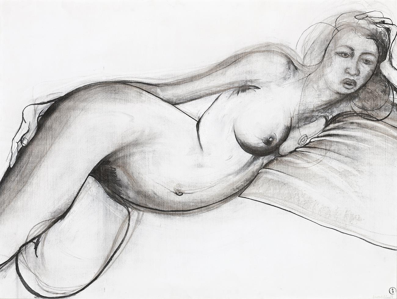 Exemplifying this sheer delight in the beauty of the female form, Nude and Necklace, 1978 was executed at the pinnacle of Whiteley’s career, with the artist awarded all three of Australia’s most prestigious art prizes that same year (The Archibald Prize for portraiture; the Wynne Prize for landscape painting; and the Sulman Prize for genre painting) – an achievement yet to be surpassed.4 Exuding a sense of languid, sensual pleasure that evokes unmistakable parallels with the reclining odalisques of his artistic mentors such as Matisse, the composition also echoes Whiteley’s own earlier ‘Bathroom series’ – his first consolidated depictions of the nude which celebrated his love for his new wife and muse, Wendy, and heralded his breakthrough as an accomplished draughtsman of the figure. Now, however, the erotic is made arguably more explicit in the model’s provocative frontality – dominating the picture plane, she is voluptuous, fecund and overtly sexual. With its extraordinary economy of line, gentle tonal modulations and palpable sensuality, the work is a superb example of Whiteley’s lifelong quest to visualise the ‘perfect’ nude; as the artist himself wrote with characteristic irreverence in catalogue notes accompanying an exhibition of comparable nudes in 1981,