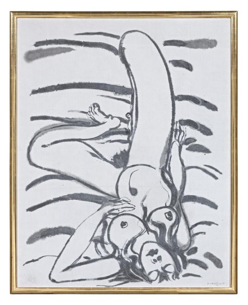For Whiteley, a deep appreciation for the sensuality of the human form permeated every aspect of his life and art. Recognised by art critic Bryan Robertson during Whiteley’s early years in London as ‘a level of sexual and sensual sophistication rare in an artist so young’1, indeed this predisposition would ultimately underpin and inspire his entire creative oeuvre. Without doubt however, it is in the myriad of paintings, drawings, sculptures and etchings dedicated to the female nude that Whiteley most thoroughly and adeptly manifests his abiding preoccupation with the sensual and tactile – exploiting the expressive and abstract possibilities of the genre to create some of the most erotic nudes ever conceived by an Australian artist. Clearly, Whiteley also considered the subject ‘predominant really…a very major part of my work’2, elaborating thus ‘…If genius is the atheist’s word for God… then the attempt to visualise the great nude would be the highest point of creation, for perfection is impossible, and no distortion can be extreme enough.’3