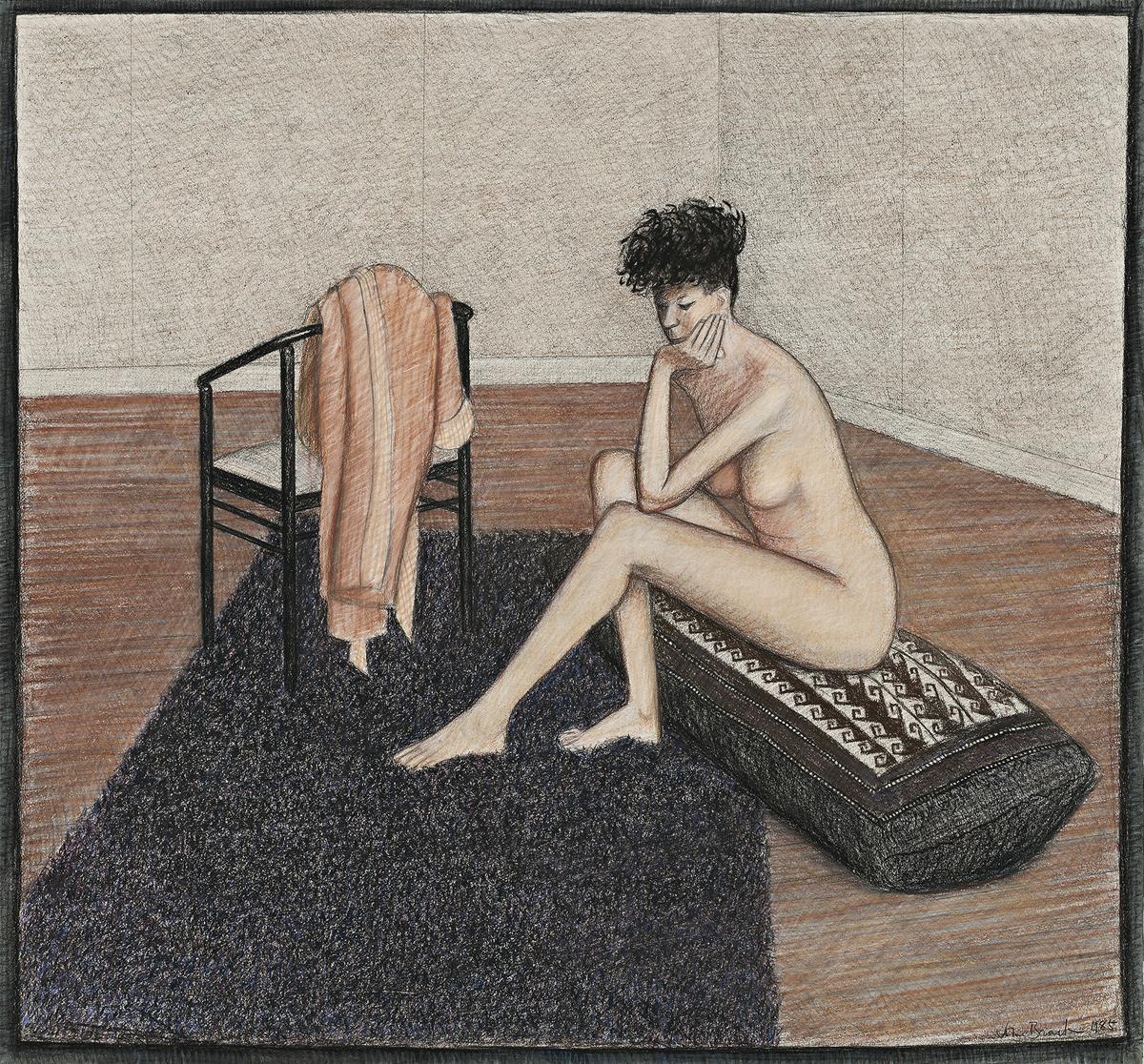 Combining watercolour with pastel and crayon, Nude with Purple Rug, 1985 brings together many of the characteristic elements of Brack’s late nudes: a spare, unadorned room; selected props – here a chair with the model’s robe draped over it, a rug and patterned cushion (taking the place of the Persian carpets he often used) – and the model, her gaze downcast, seated in a thoughtful, reflective pose with her head resting in her hand. Strong diagonals lead the eye from the base of the picture towards the centre where the texture of the rug and the model’s curly hair contrast with the crisp lines that define the walls and floorboards. In turn, these are echoed by the outlines of the chair, rug and cushion, as well as the model’s long angular limbs – making this drawing a study in texture and form. A talented draughtsman, Brack enjoyed the formal challenges of drawing from life and works such as this attest to his skills of observation and ability to describe the nuances and idiosyncrasies of his subject, as well as his mastery of pictorial composition.