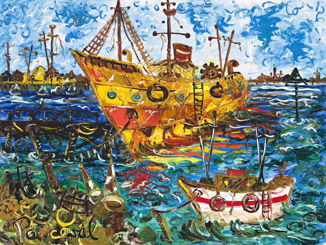 John Perceval was the youngest member of the celebrated ‘Angry Penguins’, a group of artists centred around patrons John and Sunday Reed in the 1940s. Through their combined efforts, Australian art underwent a revolution and the various members are rightly recognised as some of this country’s most significant creators. Perceval’s influence was also critical, with his ground-breaking ceramics known collectively as ‘The Angels’ – ‘one of the most important one-man shows held in Australia since the war’1 – and his extended series of paintings based around Melbourne’s working port at Williamstown. The Old Boat at Port Melbourne is from late in the artist’s career when Perceval emerged from years of troubled isolation with a renewed sense of purpose, creating paintings full of exuberant energy and joyous, juicy paint.
