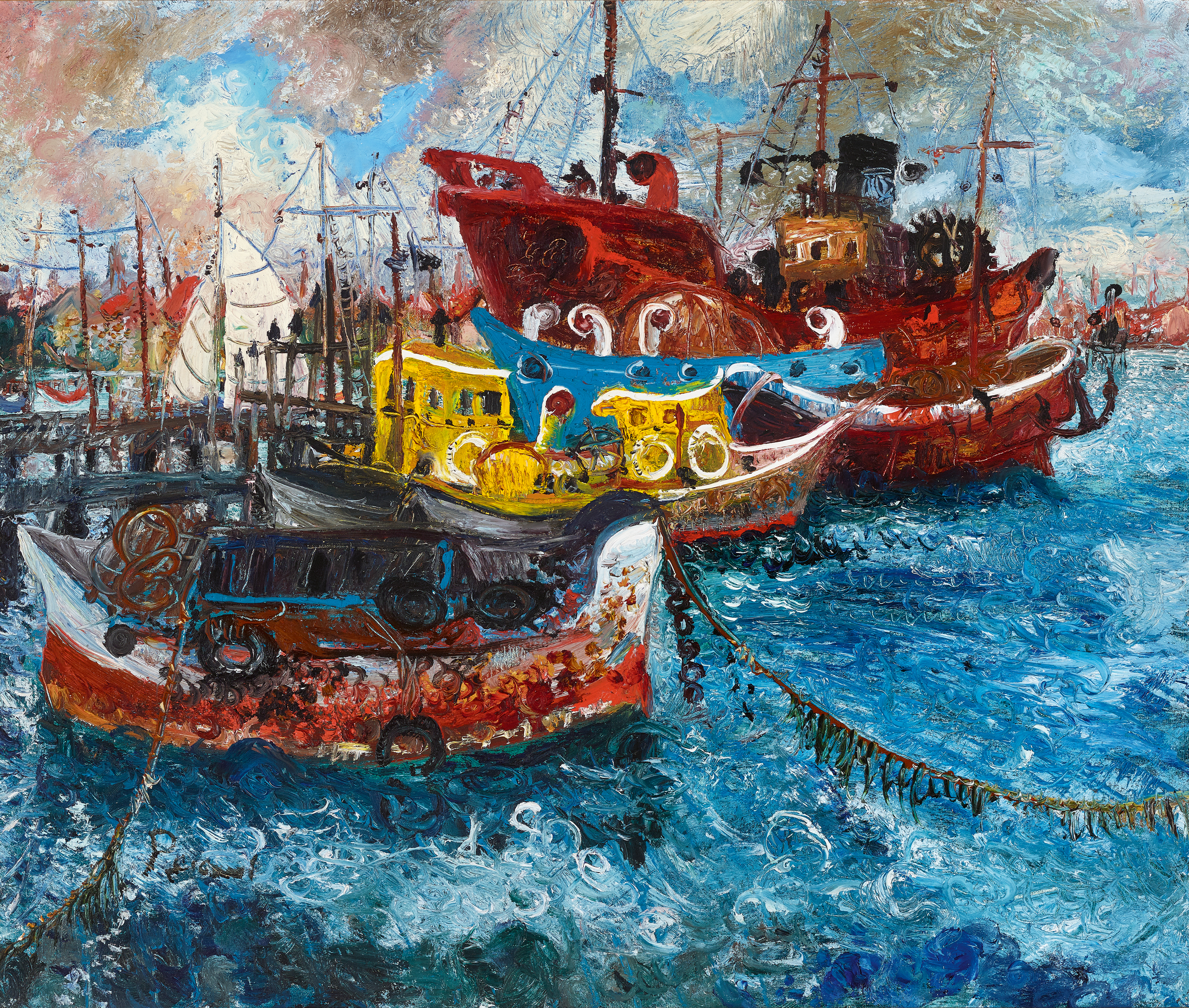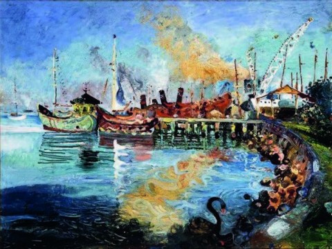 Amidst the turbulent war years of the 1940s, the art patrons John and Sunday Reed gathered a coterie of artists and writers around them at their farm cottage ‘Heide’ in the northern suburbs of Melbourne. Known now and forever as the Angry Penguins, their number includes Sidney Nolan, Joy Hester, Albert Tucker, Arthur Boyd and the youngest, John Perceval. Through the combination of drive and ambition, they and the Reeds collectively set a highly influential course through the trajectory of Australian post-war modernism. Incredibly, none of the artists ever graduated from art school and some had never even set foot within such an institution. They were, for the most part, self-trained but were also voracious readers absorbing ideas, suggestions and techniques that fed directly into the art they were making. For all but Hester, the 1950s brought fame and wealth, and Perceval’s Old Ships at Williamstown, 1959, is the perfect example of why this occurred, a life-affirming and boisterous view of the otherwise run-down port on Port Phillip Bay.