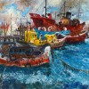 Perceval returned to Williamstown in 1959 and painted a second, smaller series. In these he employed a higher key in his colours than that used in the earlier images, seen to full effect in Old Ships at Williamstown. As before, there is a palpable energy to these paintings – even a tang of salt air and diesel – but at their core is the artist’s distinctive technique and rigorous self-training, evident is such passages as the perfectly serried dashes that articulate the weed on the foreground ship’s ropes. Perceval’s design sets the cluster of the rusting ships against the sail of a passing yacht and, in the distance, the low profile of Melbourne city, under a sky full of scudding clouds, choppy on a base of Anne Purves’ lacy waves.