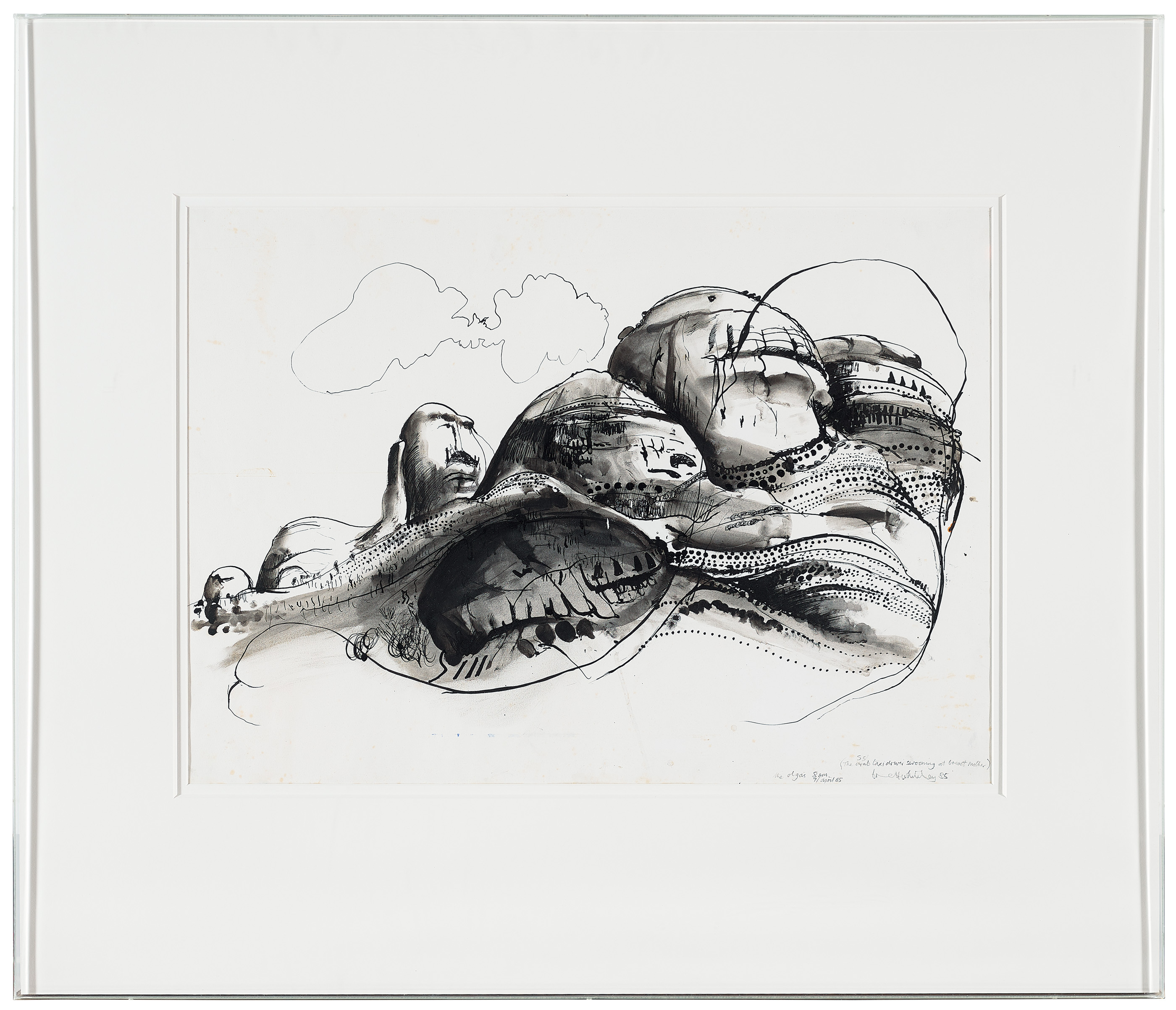 signed, dated and inscribed lower right: the olgas 8 AM.. / 7/april 85 / 55 / (The arab taxi driver swooning at breast mother) / brett whiteley 85