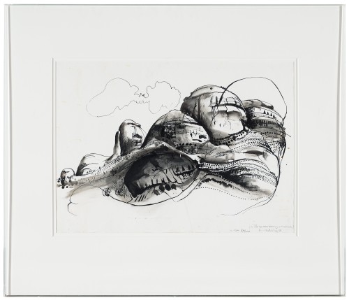 Like the female form, landscape was a site of sensuality and visual and creative pleasure for Whiteley and given his numerous depictions of the breasts, hips and curves of his wife and muse Wendy, one cannot help but see her form echoed in the sumptuous shapes of The Olgas, 8am, 1985. As Whiteley explained: ‘I know that in my work there is a certain sensuality, sexuality; there is an addiction to the curve, and to the carnal; to the rounded, I mean even to lust almost … I see sexuality, or sensuality, everywhere. I see it in clouds, and in mountains, and in fruit. And seemingly, most human motivation is caused by it – it’s a very, very deep force. And I accept it inside myself and in fact, I try as overtly as possible to allow that force to key my painting.’5