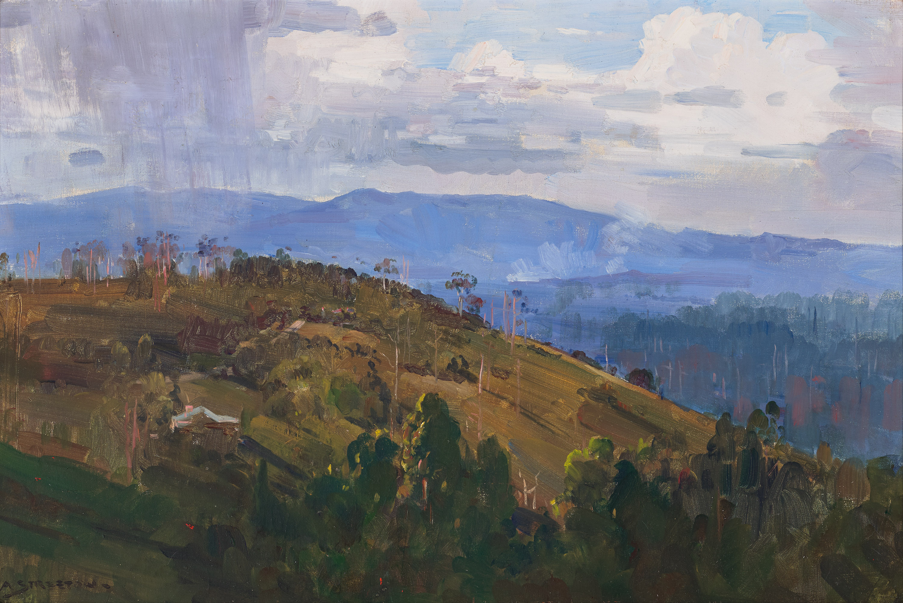 After twenty-three years abroad as an expatriate in London, Streeton returned to Australia permanently in September 1923 and, following the sale of his iconic Golden Summer, Eaglemont, 1889 (National Gallery of Australia) for the extraordinary sum of 1000 guineas in 1924, was able to build a house on land he had purchased in 1921 at Olinda in the Dandenong Ranges. Initially a weekend retreat and place of contemplation before becoming his permanent home in 1939 after the death of his wife Nora, the house he built there – ‘Longacres’ – and the surrounding hills and panoramic vistas offered the perfect setting for Streeton to consolidate his appreciation of momentary sensations of colour and light and to explore new ways of representing the Australian landscape. As he wrote to his dear friend and fellow artist, Tom Roberts, ‘It’s refreshing to note how the old Dandenong Range takes hold directly as soon as you get there…’1 Living in this landscape, nurturing the indigenous trees on his property, and blending them into a garden of introduced plants and flowers led to an intimate knowledge of the environment2 – and in turn, some of his most enduring and memorable works.