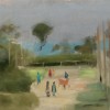 Judging by the long coats, Out Walking was painted on an early Spring morning, with the overcast sky punctured at points by sunshine which illuminates patches of the sandy road and grassed verge. To the left, a carer in a blue coat watches a red-caped girl as she rushes towards the intersection. Two older ladies in grey hats and coats walk the other way, deep in conversation; and, crunching the unsealed road between them, the hand-propelled cart in the middle-centre. The rows of telegraph poles create a frame within the frame, anchored horizontally by the white fence line indicating the cliff path. To the left, a flash of muted red indicates an emergency box, a tiny detail of colour which links visually to the girl’s cape and the man’s cart. Like the companion work with the same title,3 Beckett’s paintings of pedestrians are predominantly solo studies, making this version of Out Walking one of the rarer compositions to include small groups of people.