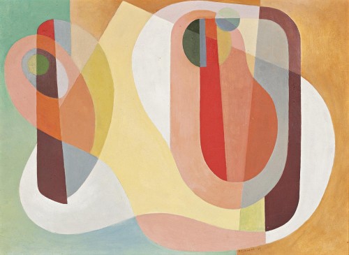 Painting, 1949 belongs to a series of important geometric ‘Constructive abstract’ paintings, all executed in tempera and pencil between 1942 – 53 and featuring a complex imbrication of planes and discs of pure, shimmering colour.2 Using this simple vocabulary of geometric forms, Hinder attempted to illustrate what he felt was the interconnectedness of all things, viewing the universe as a complex machine, whose parts all moved together in time. As opposed to Crowley and Balson, Hinder’s paintings always retained a link, however fragile, to figuration. His abstract works of this time were produced in tandem to figurative sketches of animals and urban scenes, stylistic elements of which informed his constructive abstracts.
