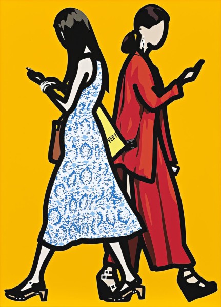 With slick surfaces and a distinctive, ultra-legible pictorial style, Julian Opie creates images that are uniquely reactive to and reflective of our contemporary society. One of Britain’s most renowned and influential contemporary artists, a late bloomer of the YBA generation, Opie has produced art that seeks to find the essential elements required for visual understanding. Taking technical cues from the economical means of commercial design and Pop Art, Opie combines flat planes of solid colour with modulated thick black outlines of his figures to produce bright and stylised urban tableaux.